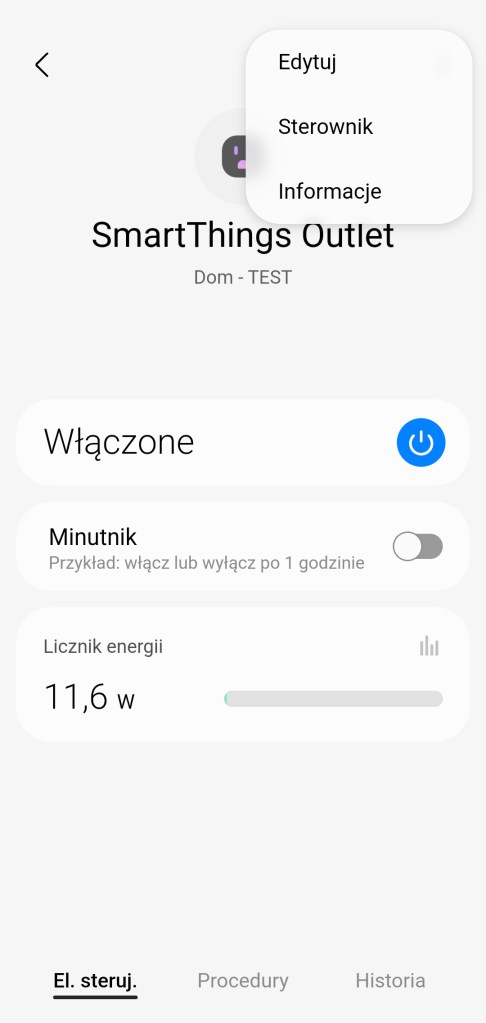 W głównym panelu sterowania urządzeniem mamy możliwość włączenia/wyłączenia gniazdka SmartThings oraz możliwość ustawienia minutnika. Na koniec mamy informację z licznika energii w watach. Na dole znajdziemy sekcję panel „Procedury” (dawniej „Automatyzacje„) znajdziemy tutaj szybkie procedury: włączenia i wyłączenia wtyczki o danej porze dnia oraz listę procedur, gdzie używane jest urządzenie. Panel „Historii” nie różni się znacznie od innych urządzeń, mamy dostęp do sortowania i przestudiowania historii działań gniazdka. W ustawieniach „Edytuj” mamy standardową możliwość zmiany nazwy, ikony, lokalizacji, pokoju oraz możliwość dodania do panelu „Ulubione”.