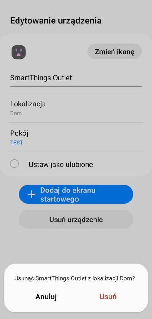 Aby usunąć gniazdko z ekosystemu SmartThings, należy wejść w główny ekran urządzenia. Kliknąć Więcej opcji ( ⋮ ) w prawym górnym rogu ekranu, a następnie Edytuj. W panelu edycji, wybieramy Usuń urządzenie. Następnie potwierdzamy operację, stukając Usuń. Pamiętaj, że usunięcie z aplikacji skutkuje również wyczyszczeniem urządzenia z wszelkich przypisanych procedur i scenerii.