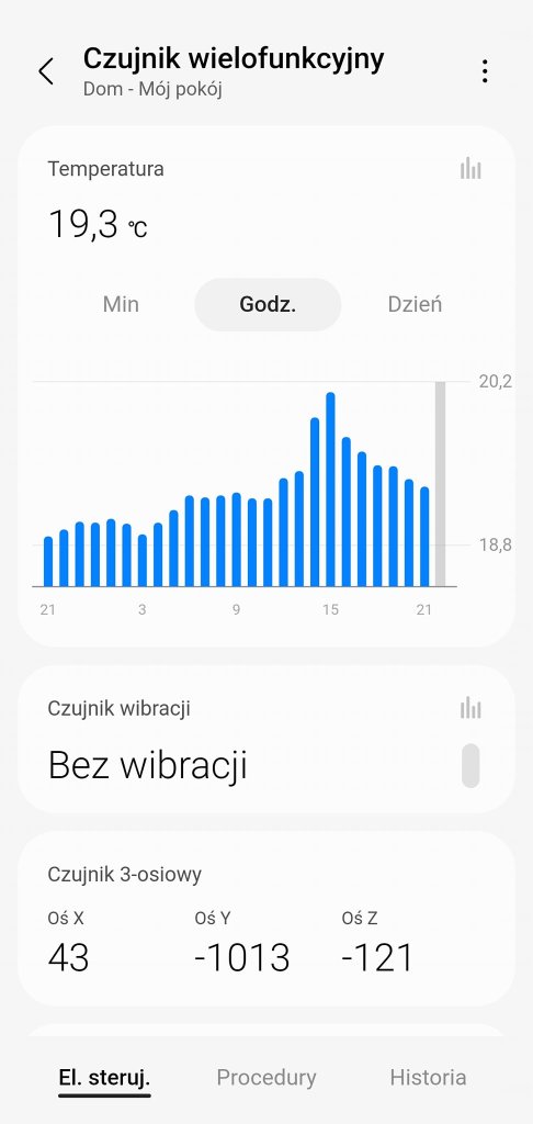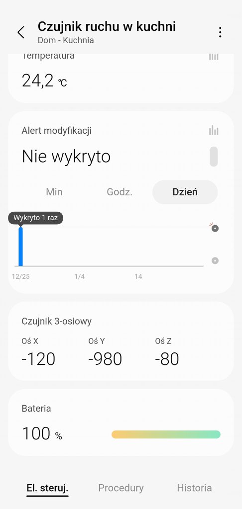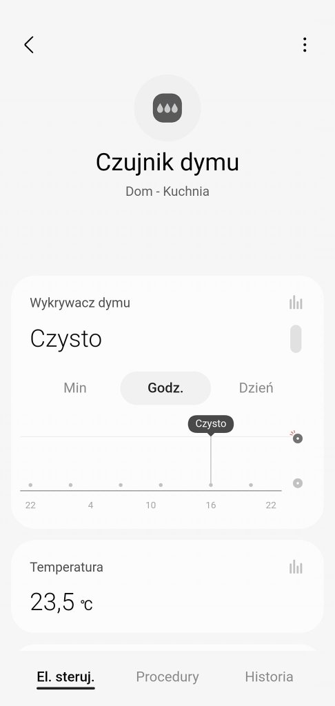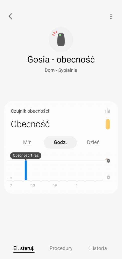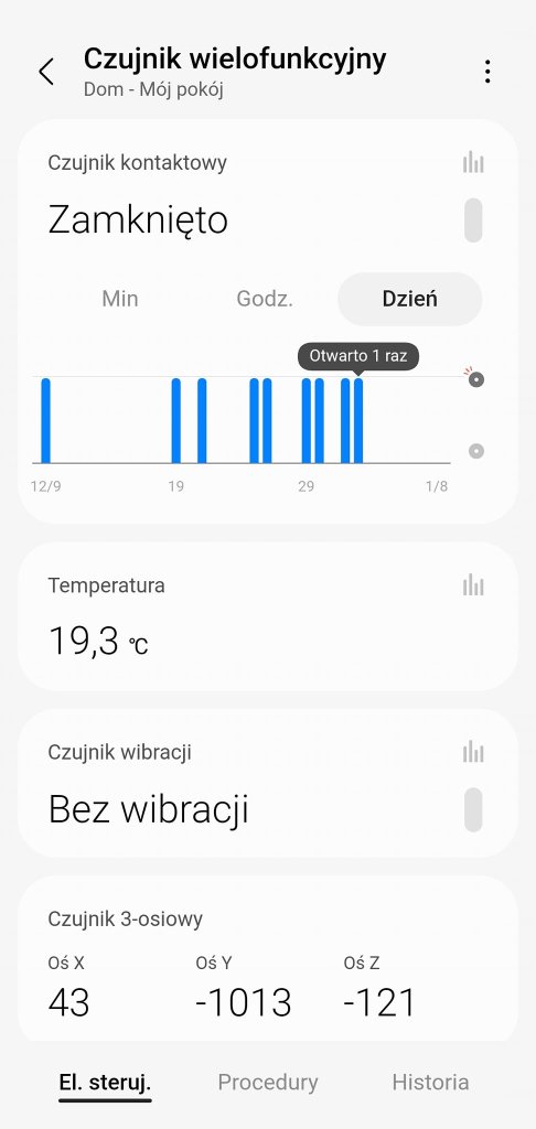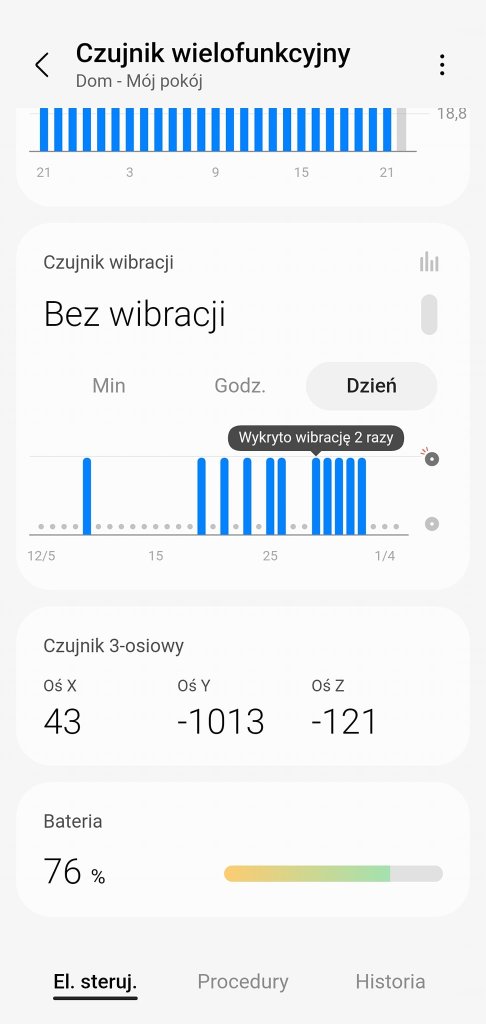 Historia czujników może być teraz śledzona za pomocą wykresu słupkowego, dotyczy niektórych typów czujników. Słupek na wykresie wskazuje czy doszło do zmiany stanu czujnika. Po przeciągnięciu palcem po wykresie, możemy się dowiedzieć ile tych zdarzeń wystąpiło w danej chwili. Dodatkowo skala czasowa jest podzielona na minuty, godziny i dni.