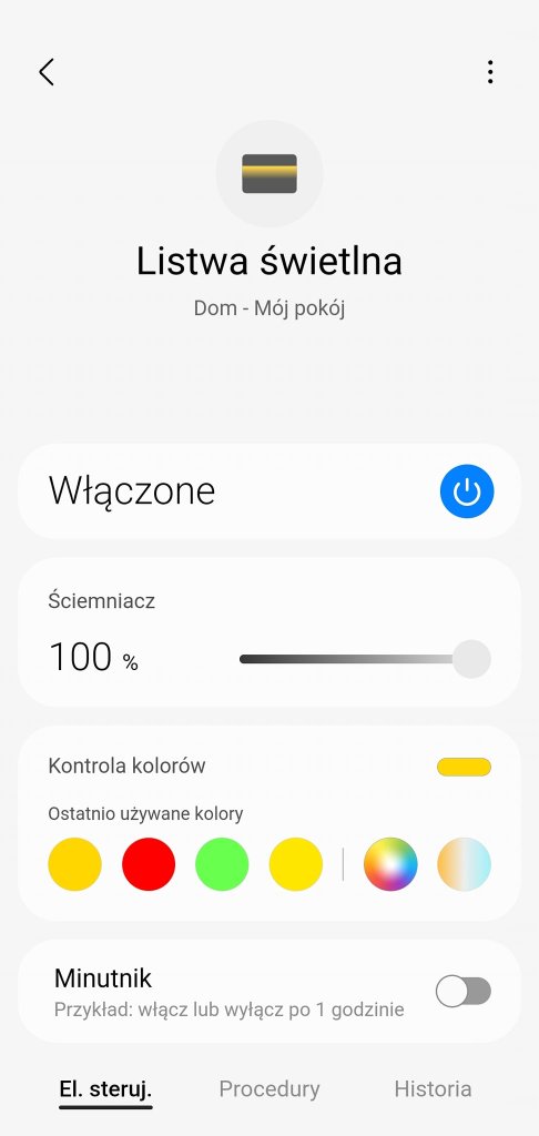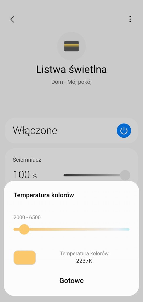 Panel sterowania oświetleniem, przykładowo żarówki kolorowej. Sterowanie kolorami i barwą temperaturową jest teraz połączone w jeden blok, pod nazwą Kontroli koloru na panelu urządzenia.