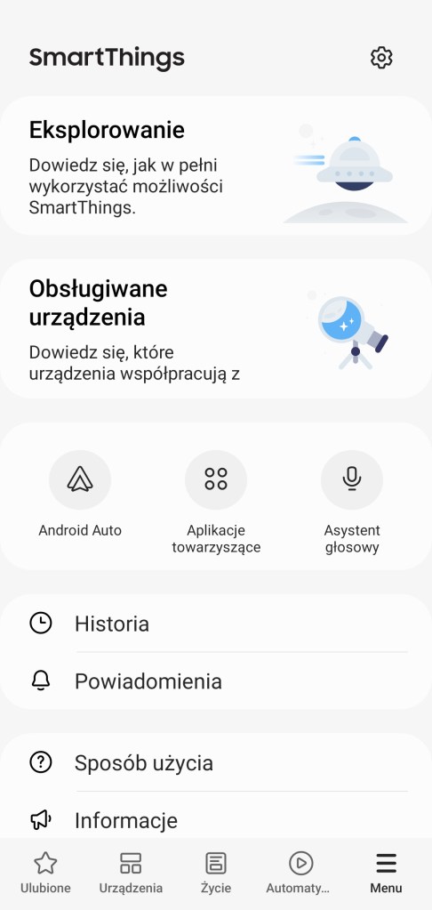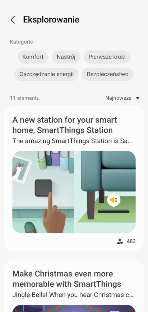 Nowa sekcja „Eksploruj” pomoże Ci w pełni wykorzystać SmartThings, prezentując nowe funkcje i produkty na podstawie historii użytkowników takich jak Ty. Nową sekcję Eksploruj można znaleźć w menu (☰) aplikacji SmartThings. Dostępne tylko dla Androida.