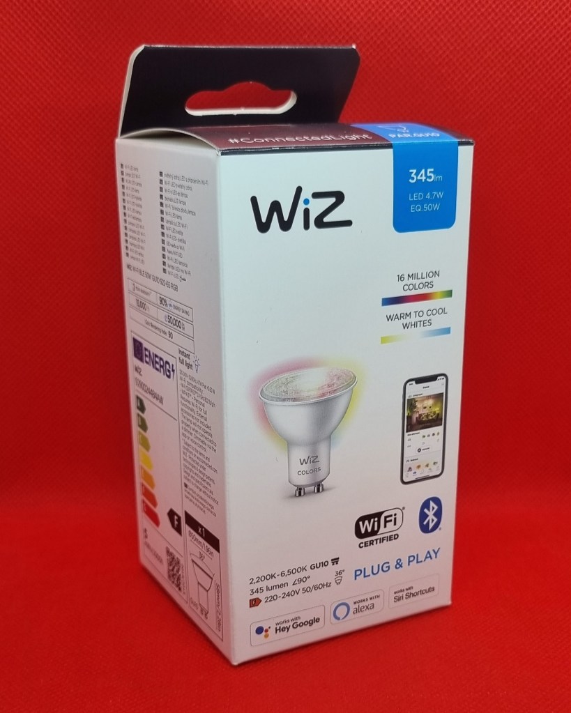 Reflektor punktowy WiZ Colors PAR16 (model Wi-Fi BLE 50W GU10 922-65 RGB 1PF/6) to żarówka LED z gwintem GU10, ze zmiennym kolorem w palecie barw RGB co oznacza aż 16 milionów kolorów i 64 tysiące odcieni bieli w zakresie 2200-6500 K, posiada dodatkowo opcję ściemniania w zakresie 1 – 100%. Maksymalnie dostaniemy tylko 345 lm jasności, pod kątem 36°. Żarówka ma moc sięgającą do 4,7W, co przy starszych oznaczało 50W, napięcie zaś 220-240V 50-60 Hz. Producent zapewnia o żywotności 15 000 godzin, co pozwala na użytkownie przez ponad 11 lat (przy 3 godzinach pracy dziennie), dodatkowo może się poszczycić starą klasą energetyczną A+, co w nowej przekłada się na F. Komunikacja odbywa się po protokole Wi-Fi (802.11 b/g/n 2,4 GHz) bądź Bluetooth, i za pośrednictwem serwera, co troszkę opóźnia reakcję na komendę. Dużym plusem jest, że żarówka WiZ nie wymaga żadnego dodatkowego huba. Żarówka posiada klasyczne wymiary 5,8 cm wysokości i 5 cm średnicy oraz 50 gramów wagi. Dostosowana do pracy w pomieszczeniach w temperaturze od -10°C do +40°C.