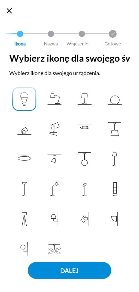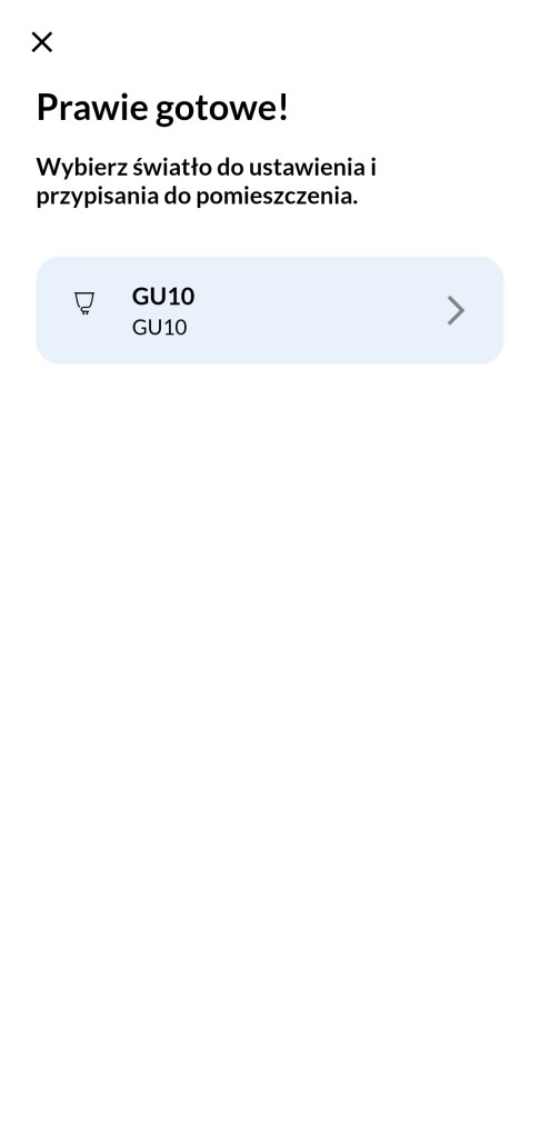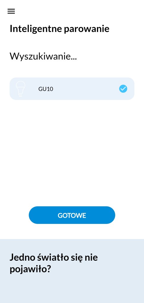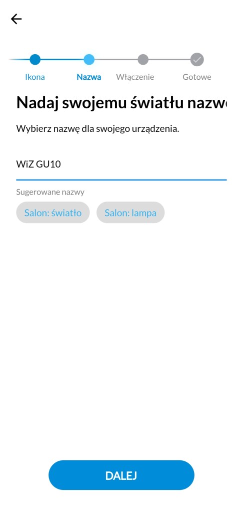 Na początku zainstalujmy żarówkę w reflektorze punktowym, wpinamy żarówkę do gwintu GU10. Zanim przejdziemy do konfiguracji reflektora musimy pobrać aplikację WiZ z Google Store bądź AppStore. Po zainstalowaniu aplikacji możemy przejść do dodania go do aplikacji WiZ. Pełną instalację wraz z tworzeniem pokoi przedstawiamy tutaj. Jeśli posiadamy już utworzony pokój, możemy przejść do dodania lampy, w prawym górnym rogu ekranu klikamy Dodaj urządzenie ( + ). Wybieramy do którego pokoju dodajemy urządzenie. Klikamy odpowiedni typ urządzenia, w tym przypadku Żarówka. Teraz rozpoczynamy parowanie urządzenia (informacja o długości fali Wi-Fi, dostępna jest tylko 2,4 GHz), wpisujemy dane do naszego routera Wi-Fi. Zależenie czy nasze urządzenie jest całkowicie nowe czy było już używane wybieramy odpowiednią opcje, w naszym wypadku to Tak, zupełnie nowe. Wykonaj instrukcje na ekranie inicjującą parowanie reflektora, kliknij Start. Po chwili zostanie znaleziona żarówka, klikamy jego nazwę. Następnie przechodzimy przez proces początkowej konfiguracji, nadajemy nazwę, wybieramy opcje dotyczące przełączania zasilania (do wyboru WiZclick lub Ostatni status), kończymy proces wybierając Gotowe, od teraz możemy sterować reflektorem z poziomu aplikacji WiZ.