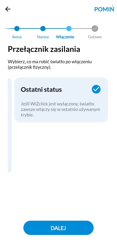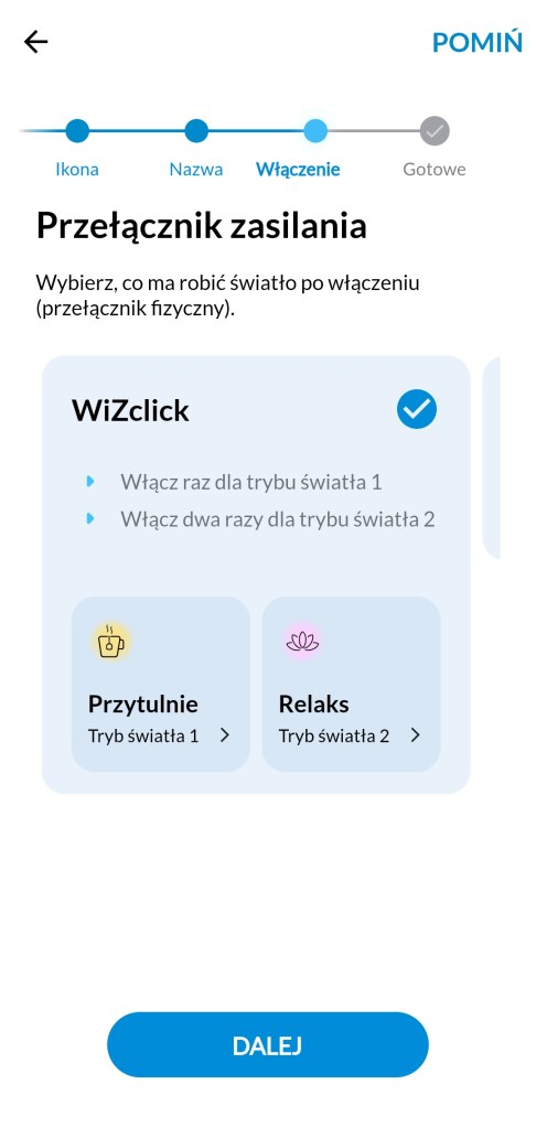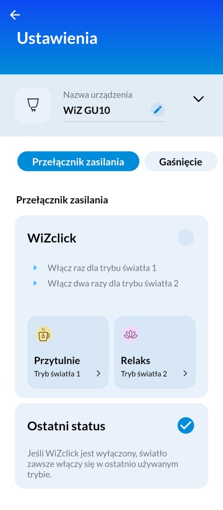 W ustawieniach żarówki WiZ, w aplikacji producenta, znajdziemy ciekawą opcję o nazwie „WiZclick”. Dzięki niej posiadamy możliwość ustawienia co się stanie po przywróceniu zasilania w gniazdku zasilającym. Posiadamy dwie opcje dla pierwszego włączenia zasilania oraz dla dwukrotnego szybkiego przełączenia włącznika ściennego. Dla każdej z opcji możemy ustawić swój ulubiony kolor. Dodatkowo możemy zrezygnować z tej opcji i reflektor po prostu zapamięta ostatni używany kolor.
