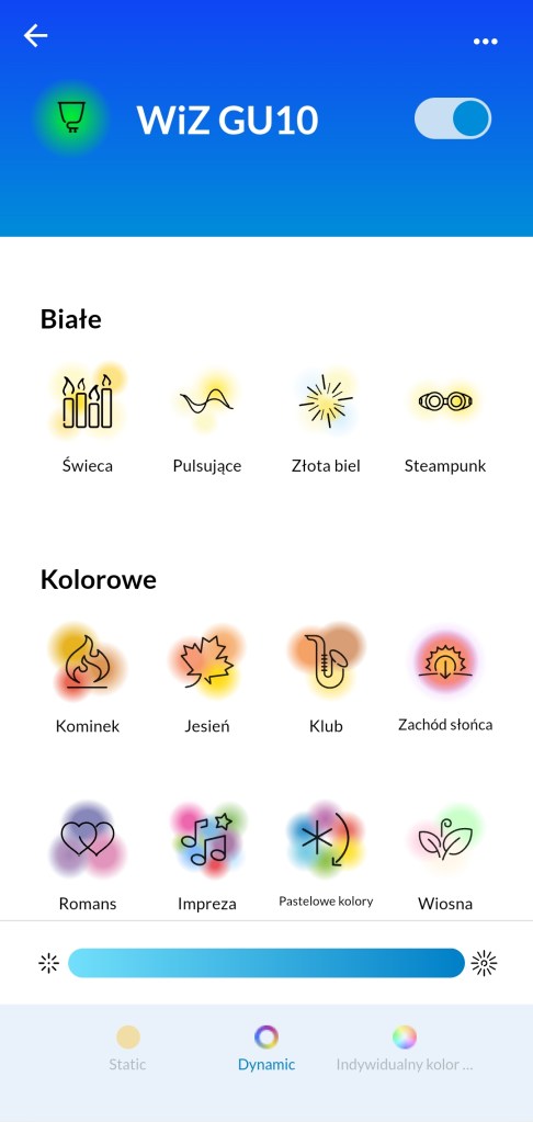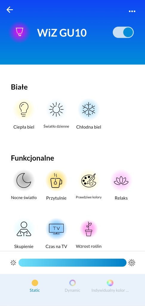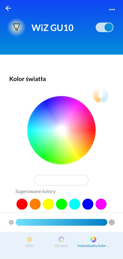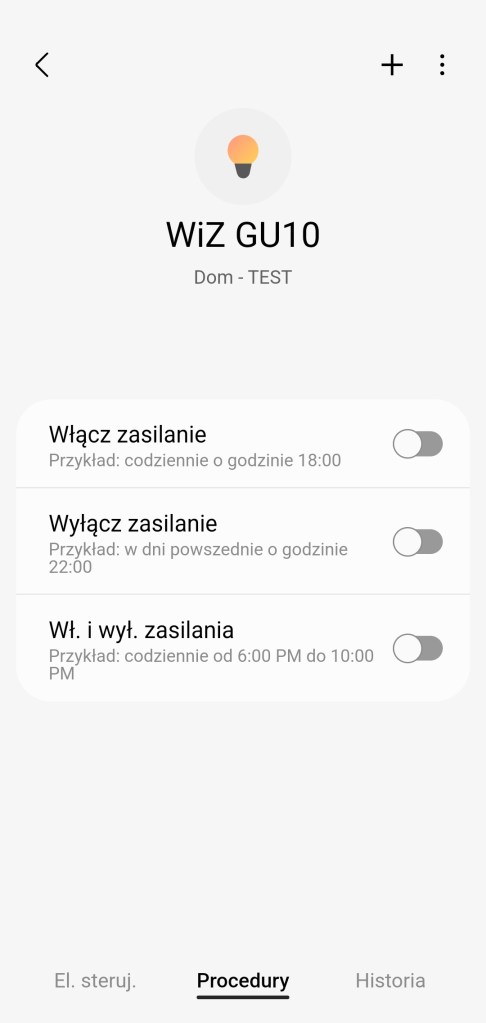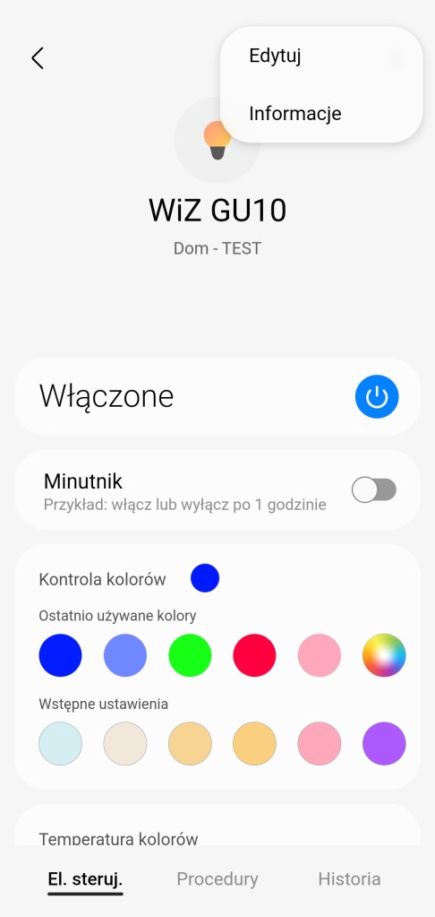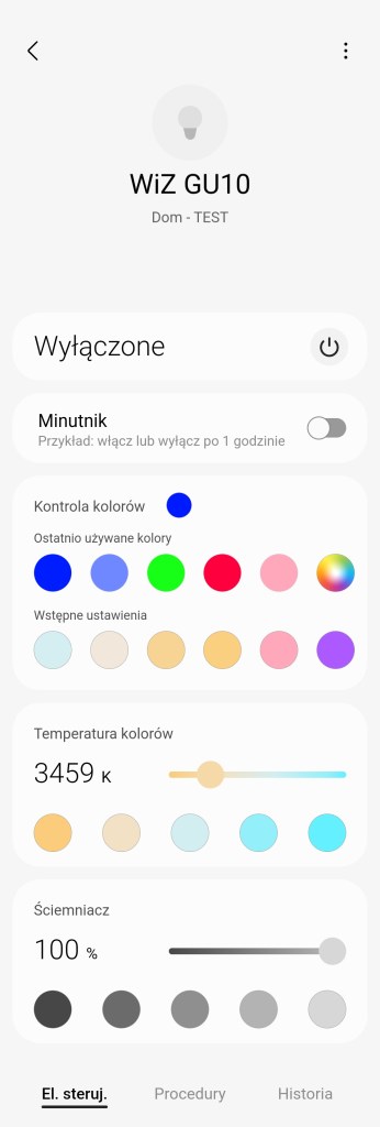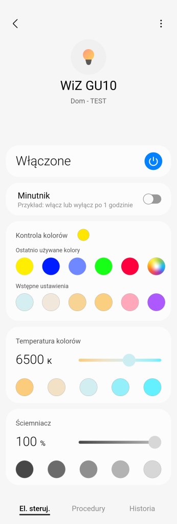 W głównym panelu aplikacji mamy możliwość włączenia/wyłączenia reflektora WiZ, możliwość ustawienia minutnika. Poniżej posiadamy możliwość ustawienia dowolnego koloru z palety barw RGB, jak i pięć ostatnio używanych kolorów oraz sześć sugestii. Kolejna belka umożliwia ustawienie temperatury światła w zakresie 2200 K – 9000 K, zakres jest błędny ponieważ w specyfikacji mamy możliwość 2700 K – 6500 K temperatury światła. Ostatnia opcja pozwala na ustawienie ściemniacza od 1 do 100%. Pod ściemniaczem posiadamy również pięć kół, będących przyciskami ustawiającymi ściemniacz na kolejno od lewej 10%, 30%, 50%, 70% oraz 90% jasności. Na dole znajdziemy sekcję panel „Procedury” znajdziemy tutaj szybkie procedury: włączenia i wyłączenia urządzenia o danej porze dnia oraz listę procedur gdzie używane jest urządzenie. Panel „Historii” nie różni się znacznie od innych urządzeń, mamy dostęp do sortowania i przestudiowania historii działań żarówki. W ustawieniach „Edytuj” mamy standardową możliwość zmiany nazwy, lokalizacji, pomieszczenia oraz możliwość dodania do panelu „Ulubione”.