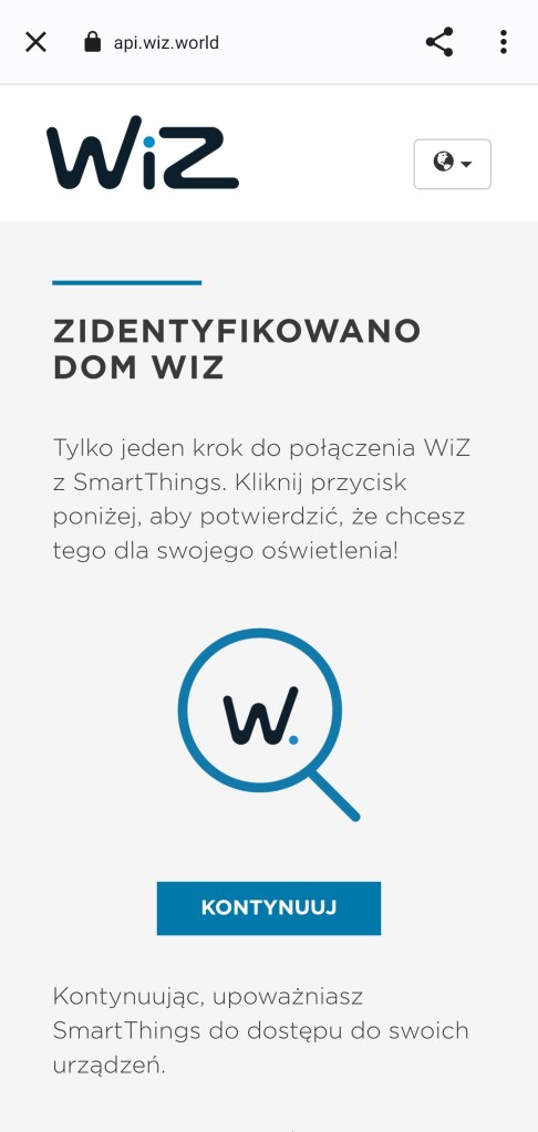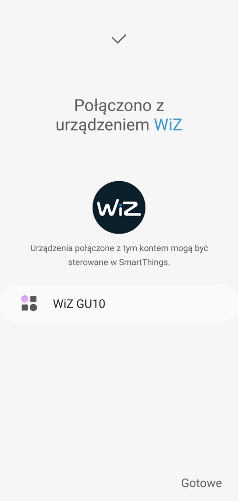 Po dodaniu urządzeń w aplikacji WiZ, możemy przystąpić do połączenia usług WiZ i SmartThings. Przechodzimy do aplikacji SmartThings, aby dodać urządzenie do inteligentnego domu. Klikamy na ekranie głównym przycisk Dodaj ( + ), w prawym górnym rogu ekranu. Następnie Dodaj urządzenie, przesuwamy w dół do sekcji marek Wybór z listy urządzeń, wybieramy markę WiZ, a później Oświetlenie. Kontynuujemy pierwsze kroki, wybierając lokalizację i pokój dla urządzenia. Zostaniemy przeniesieni na stronę internetową WiZ, gdzie wpisujemy wcześniej skopiowany kod aktywacyjny, klikamy strzałkę. Zostaniemy poinformowani o zidentyfikowaniu i potwierdzamy połączenie z ekosystemem SmartThings, klikając Kontynuuj. Zostaniemy poinformowani o udanym połączeniu usług WiZ i SmartThings. Zamykamy iksem w lewym górnym rogu stronę internetową i po chwili pokaże nam się lista wszystkich urządzeń z aplikacji WiZ. Klikamy Gotowe, znalezione urządzenia pojawią się nam na dole w sekcji nieprzypisanych do żadnego pokoju urządzeń.