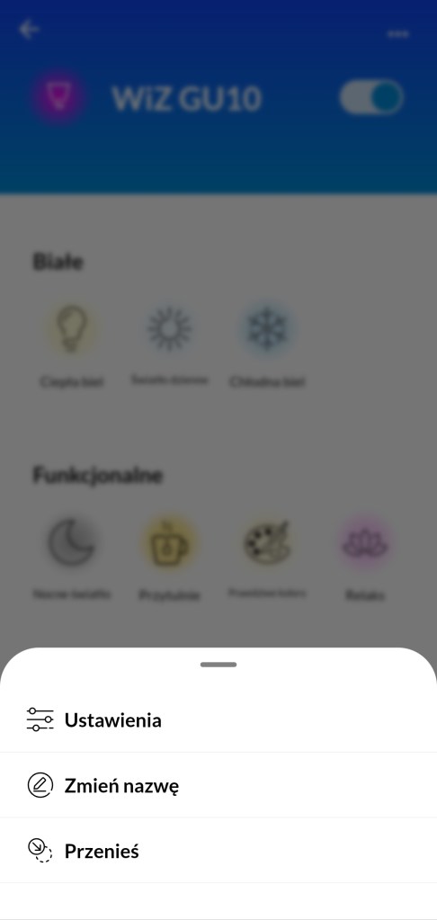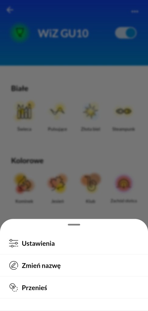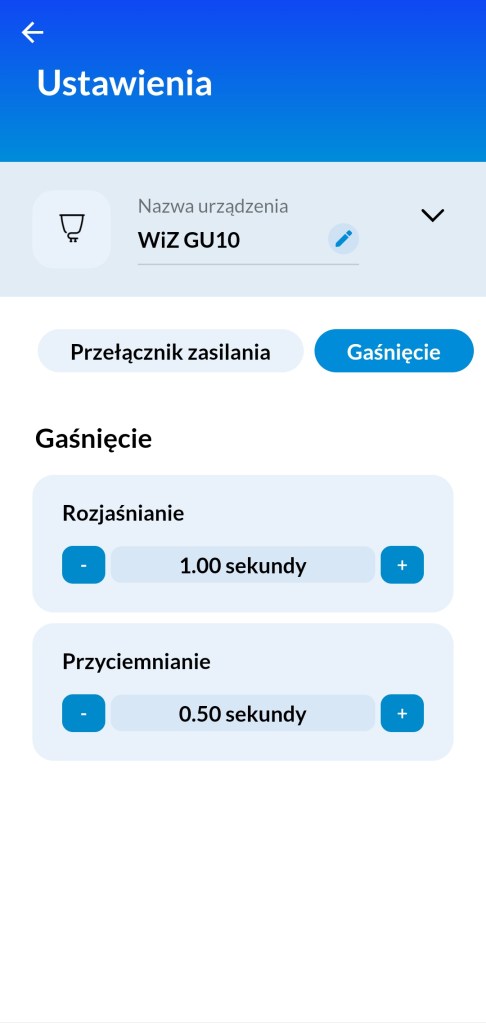 Ustawienia te znajdziemy tylko w aplikacji WiZ, przechodzimy do pomieszczenia, a następnie do głównego panelu sterowania reflektora. W prawym górnym rogu ekranu, znajdziemy Więcej ustawień ( … ), następnie klikamy Ustawienia. Możemy teraz ustawić reakcję urządzenia na przełączanie zasilania oraz szybkość gaśnięcia oświetlenia.