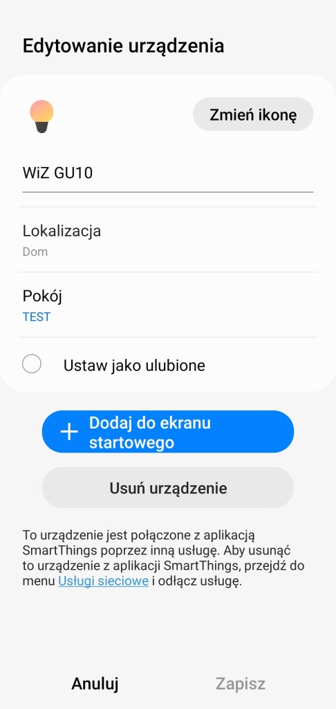 Posiadamy dwie możliwości usunięcia reflektora z ekosystemu SmartThings. Pierwszym z nich jest odłączenie usługi sieciowej WiZ z aplikacji SmartThings. Pamiętaj jednak, że usunięte zostaną wszystkie inne urządzenia WiZ. Usunięcie z aplikacji skutkuje również wyczyszczeniem urządzeń z wszelkich przypisanych automatyzacji i scenerii. Pełną instrukcję odłączenia usług znajdziesz tutaj.