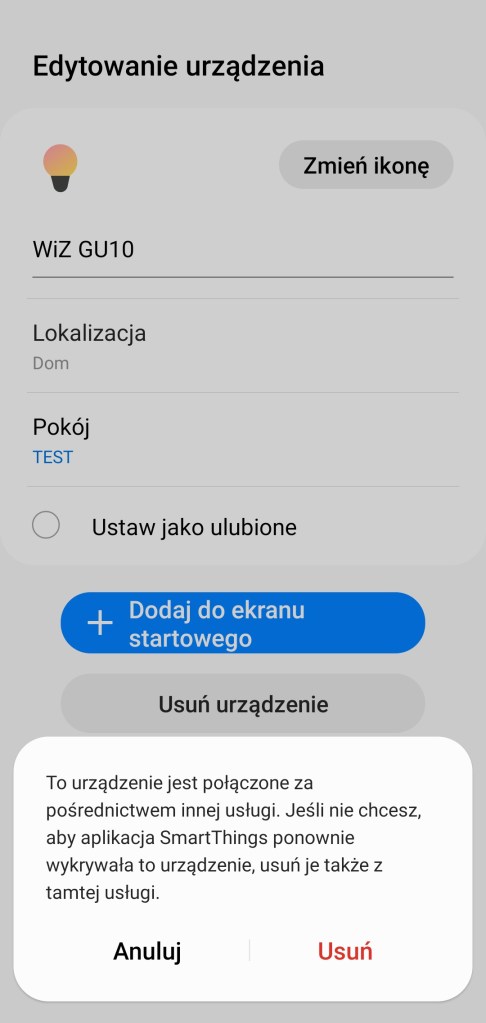 Aby usunąć tylko jedno urządzenie, w naszym wypadku reflektora, z ekosystemu SmartThings, należy wejść w główny ekran urządzenia. Kliknąć Więcej opcji ( ⋮ ) w prawym górnym rogu ekranu, a następnie Edytuj. W panelu edycji, wybieramy Usuń urządzenie. Następnie potwierdzamy operację, stukając Usuń.