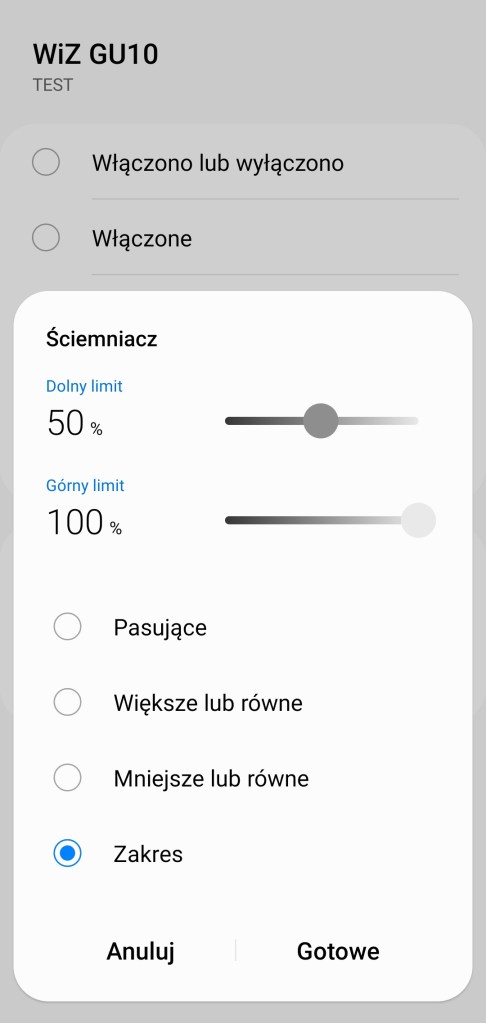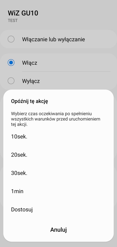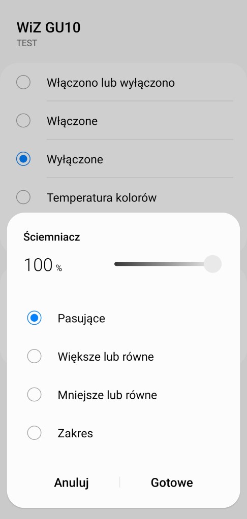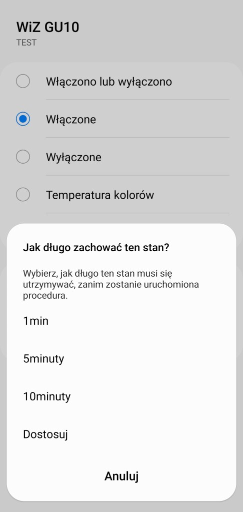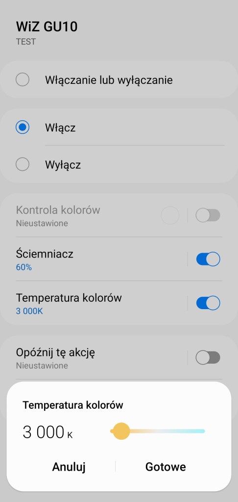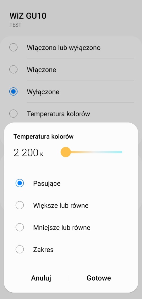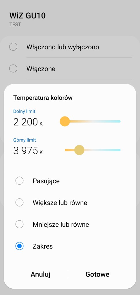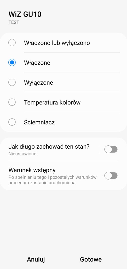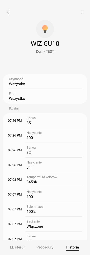 Tworzenie procedur (dawniej automatyzacje) „Jeśli … to Wtedy” musimy podzielić na dwa etapy, ponieważ znacznie różnią się dostępne opcje, jeśli inicjujemy warunek „Jeśli”. W pierwszej możliwości „Jeśli” urządzenie pozwala na wybranie opcji „Włączono lub wyłączono” czyli zmiana stanu, oraz „Włączone” i „Wyłączone”. Poniżej mamy wartość ściemniacza i temperatury kolorów z zakresu 2200 – 9000 K. Zakres temperatury kolorów jest błędy, taśma LED pozwala uzyskać 2700 K – 6500 K. Możemy ustawić również zakres tych wartości. Dodatkowo posiadamy opcję jak długo zachowany powinien być stan przed uruchomieniem automatyzacji oraz czy ma być to warunek wstępny. W drugiej możliwości „Wtedy”, świeczka pozwala na dużo więcej, mamy pełną możliwość tworzenia opcji przydatnych w programowaniu już np. scenerii. Mamy ponownie opcje „Włączono lub wyłączono” czyli zmiana stanu, oraz „Włączone” i „Wyłączone”. Ustawienie jednego z kolorów, jasności reflektora z zakresu 0 – 100%, bądź temperatury barwy z zakresu 2200 – 9000 K. Tutaj również pojawia się ze zbyt dużym zakresem temperatury świetlnej. Akcję uruchomienia żarówki możemy opóźnić o dowolny czas, jak i wyłączyć ją automatycznie po ustalonym czasie.