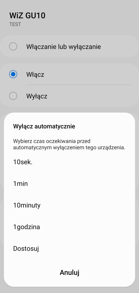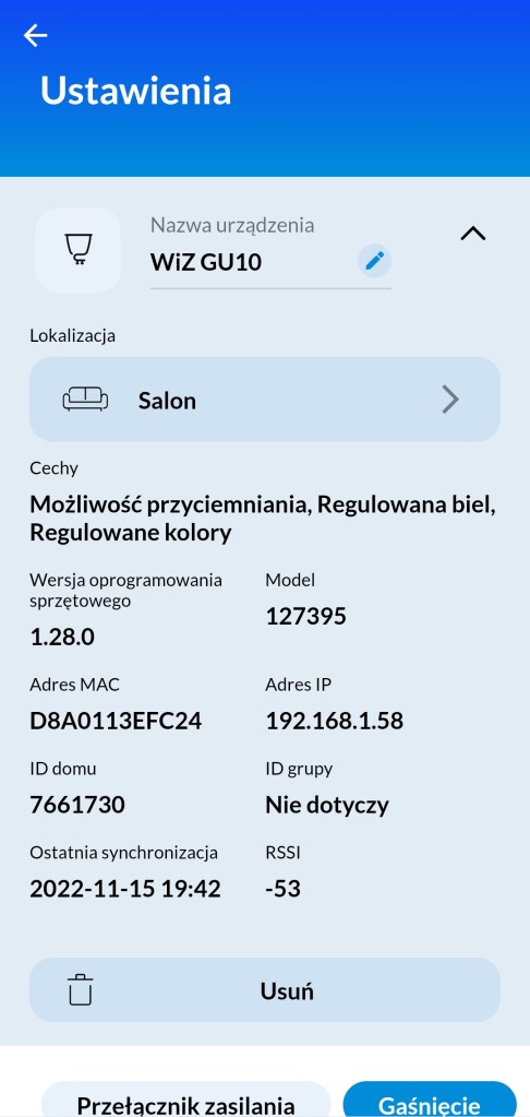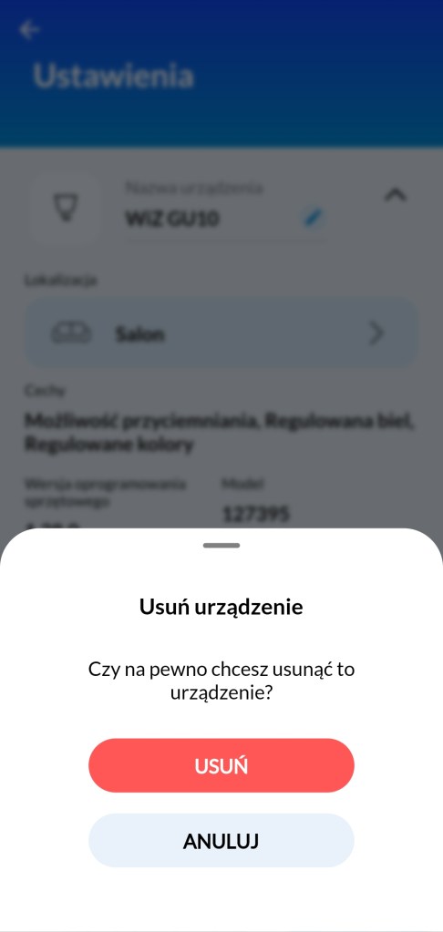 Aby uniknąć ponownego wyszukania urządzenia przez aplikację SmartThings, należy również usunąć reflektor z aplikacji WiZ. W tym celu otwieramy aplikację WiZ, przechodzimy do pomieszczenia, a następnie do głównego panelu sterowania żarówki. W prawym górnym rogu ekranu, znajdziemy Więcej ustawień ( … ), następnie klikamy Ustawienia. Możemy teraz ustawić reakcję urządzenia na przełączanie zasilania oraz szybkość gaśnięcia oświetlenia. Aby usunąć reflektor, należy wybrać strzałkę ( ˅ ) przy nazwie, wyświetlą się szczegóły urządzenia, na dole klikamy Usuń a następnie potwierdzamy Usuń.