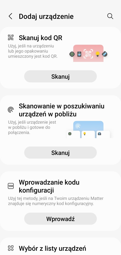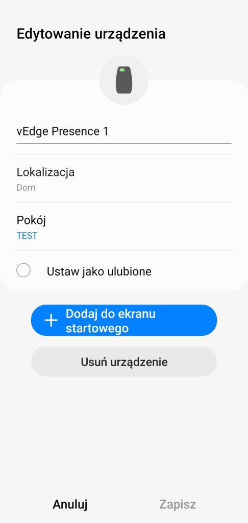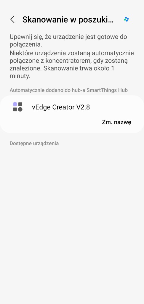Po zainstalowaniu sterownika przechodzimy do aplikacji mobilnej SmartThings. I wykonujemy standardowe czynności dodania nowego urządzenia. Na ekranie głównym aplikacji, klikamy Dodaj ( + ) znajdujący się w prawym górnym rogu ekranu, następnie Dodaj urządzenie. Wybieramy opcje Skanuj w sekcji Skanowanie w poszukiwaniu urządzeń w pobliżu. Spowoduje to dodanie nowego urządzenia o nazwie vEdge Creator V2.8, które będzie można znaleźć w pokoju o nazwie Brak przypisanego pokoju. Oczywiście można je później przenieść do dowolnego pomieszczenia.