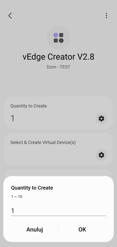 Odnajdź nowe urządzenie o nazwie vEdge Creator V2.8, mamy tutaj możliwość tworzenia kilkanaście typów wirtualnych urządzeń. Panel sterowania pozwala ustalić liczbę urządzeń, które chcesz utworzyć oraz jaki typ urządzenia mają reprezentować. Jak i sprawdzić ilość już stworzonych urządzeń danego typu.