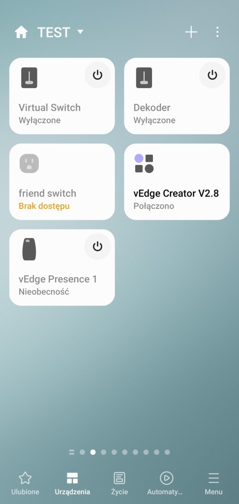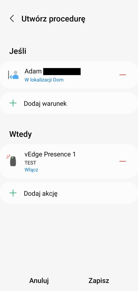 W mobilnej aplikacji SmartThings możemy tworzyć procedury (dawniej „automatyzacje”) powiązane z lokalizacją. Wiele reakcji inteligentnego domu, podyktowane jest, zależnością od kilku lokalizacji telefonów naszych domowników. Przykładowo, kiedy wszyscy członkowie opuszczą obszar domu, Home Monitor ma uzbroić alarm. Niestety tutaj pojawia się mały problem, ponieważ nie jesteśmy w stanie podejrzeć w aplikacji, aktualnego statusu naszych domowników. Czy znajdują się oni na terenie naszego domu, czy poza nim? Kiedy przychodzi moment, że automatyzacja powinna się wykonać, a tak się nie stało. Należy szukać informacji, u którego z użytkowników pojawił się błąd lokalizacji. Z rozwiązaniem przychodzi wirtualny czujnik obecności i generator wirtualnych urządzeń vEdge Creator autorstwa Tustin.