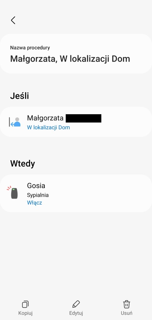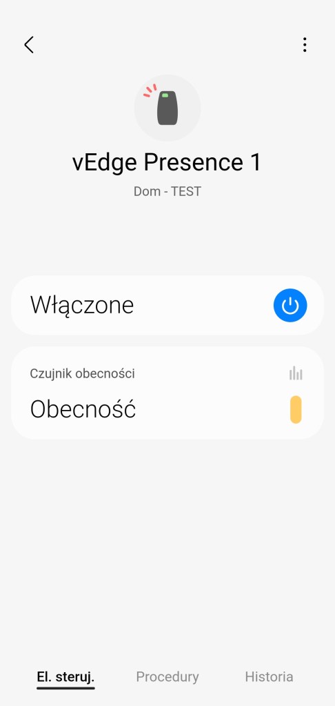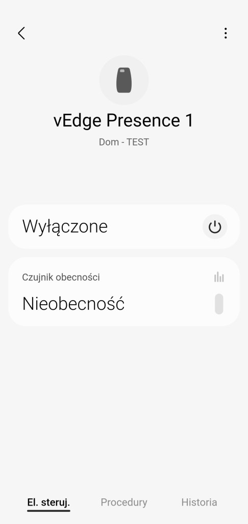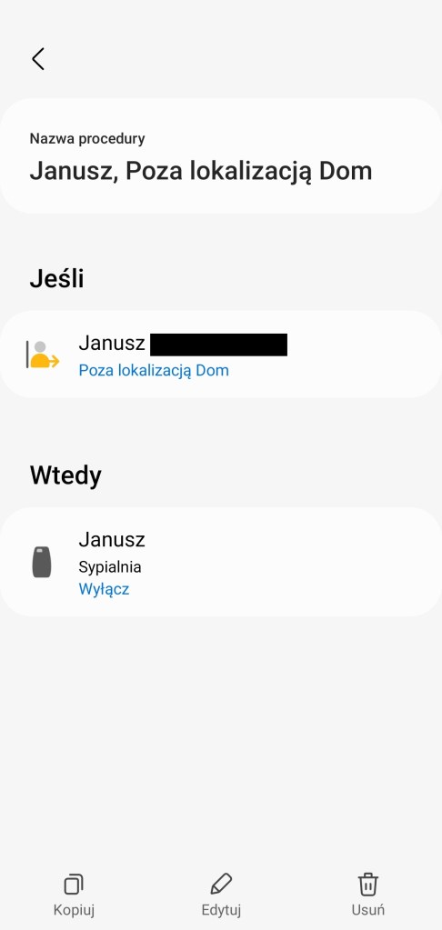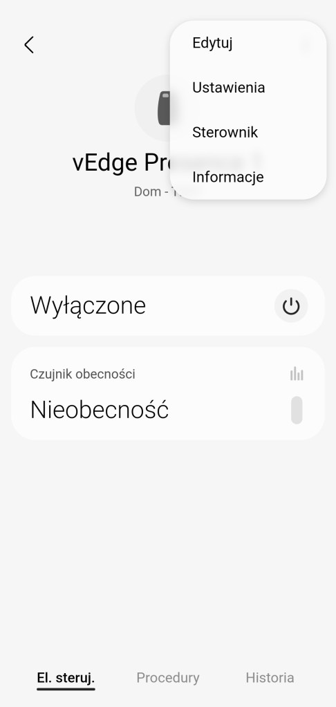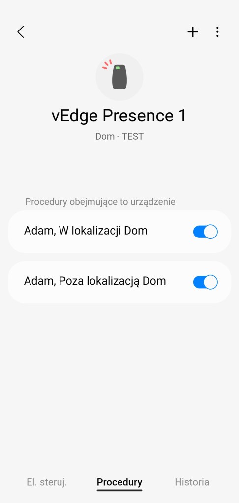 Po utworzeniu procedur będą one przełączać stan czujnika obecność. Zależnie czy urządzenie domownika będzie lub nie w lokalizacji inteligentnego domu. Nazwę czujnika obecności w każdej chwili można zmienić, przechodząc do Więcej opcji ( ⋮ ) >> Edytuj i zmień nazwę urządzenia.