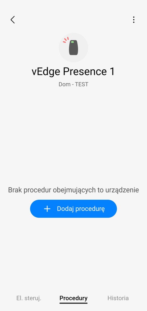 Aby czujnik obecności działał prawidłowo, wymagane jest jeszcze utworzenie dwóch procedur, będą one zmieniać stan obecności naszego czujnika. W panelu sterowania czujnika obecności, o nazwie vEdge Presence 1. Kliknij na dole ekranu sekcję Procedury, a następnie Dodaj procedurę. Musimy powiązać wirtualny czujnik obecności z lokalizacją innego użytkownika czy też bardziej jego urządzenia np. smartfonu, czy tabletu.