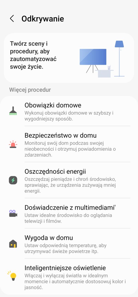 Zakładka Odkrywanie (ang. Discover) zapewnia łatwe do zbudowania, wstępnie utworzone procedury do wypróbowania na platformie SmartThings. Dodatkowo mamy propozycję urządzeń, jakie należy zakupić, aby skorzystać z opisywanej automatyzacji.