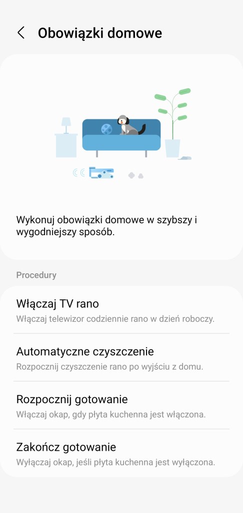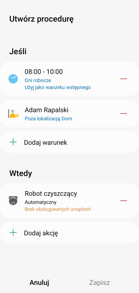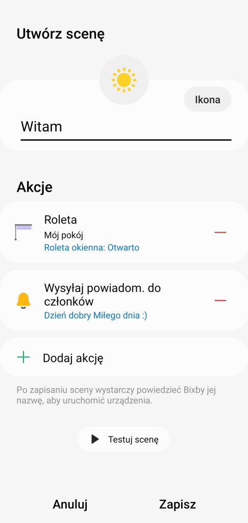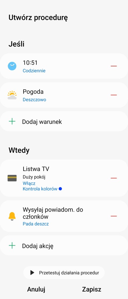 W czasie tworzenia procedury czy sceny, przed zapisaniem i dodaniem automatyzacji do aplikacji SmartThings, możemy teraz przetestować jej działanie. U dołu ekranu znajduje się opcja ▶ Przetestuj działania procedury. Jedyne zastrzeżenie zaawansowane funkcje, takie jak opóźnienia akcji lub automatyczne wyłączanie, nie będą uruchamiane podczas testowania.