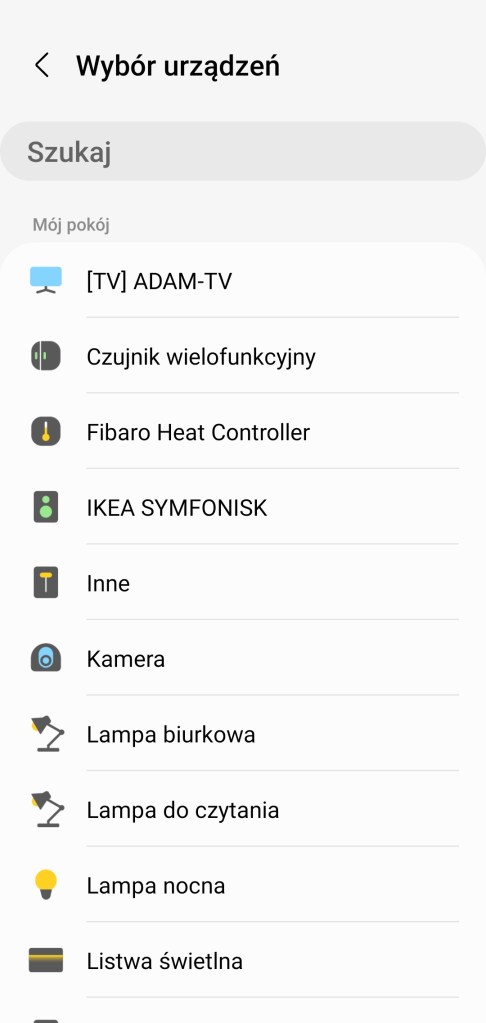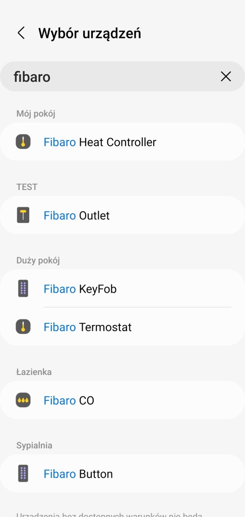 Od teraz podczas tworzenia procedury, wybierania urządzeń dla akcji i warunków automatyzacji. Mamy dostęp do paska wyszukiwania, który pozwoli szybko znaleźć urządzenie po jego nazwie.