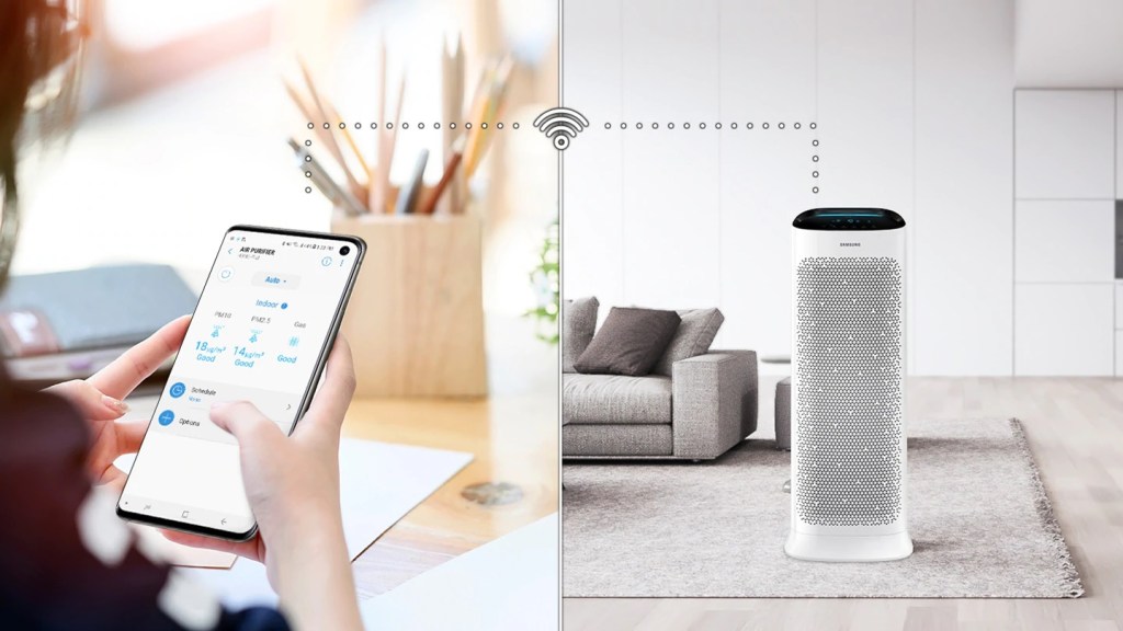 Inteligentny dom to również zdrowy dom. Czyli taki, w którym jakość powietrza jest dobra, a my możemy oddychać pełną piersią. O ten aspekt zadba oczyszczacz powietrza Samsung, który usuwa aż do 99,97%* zanieczyszczeń, a który uruchomisz z pomocą aplikacji, jeszcze przed przyjściem do domu.