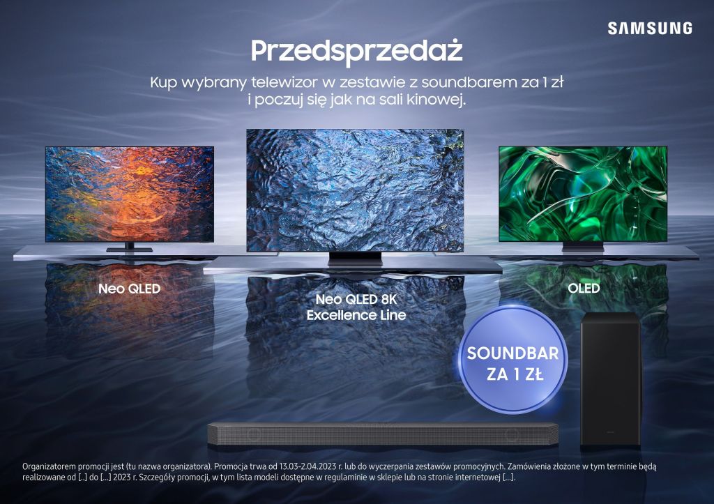 Samsung rozpoczął pierwszą przedsprzedaż telewizorów z portfolio na 2023 rok. Ofertą objęte są wybrane modele z serii Excellence Line Neo QLED 8K, Neo QLED 4K i OLED. Widzowie, którzy zamówią je już teraz mogą otrzymać dedykowany soundbar za 1 zł. Promocja obowiązuje od 13 marca do 2 kwietnia 2023 roku lub do wyczerpania puli produktów promocyjnych.