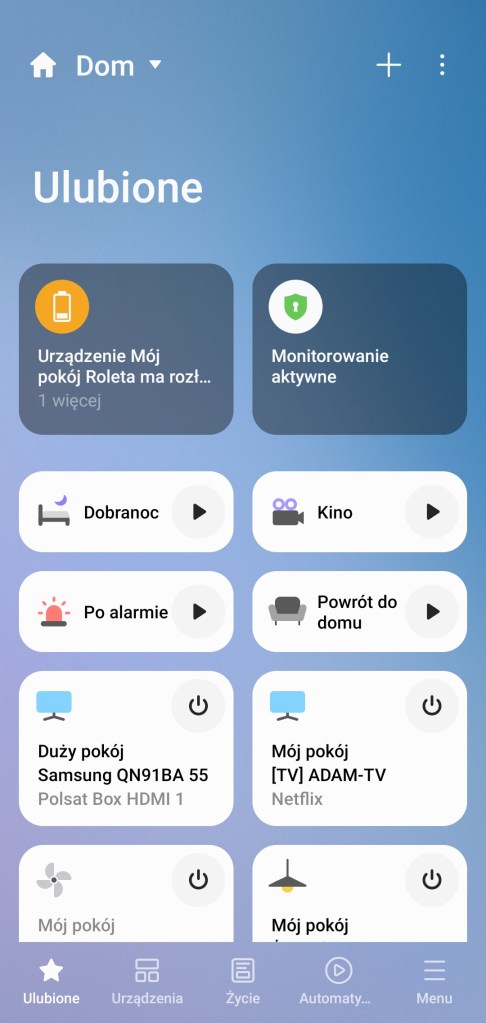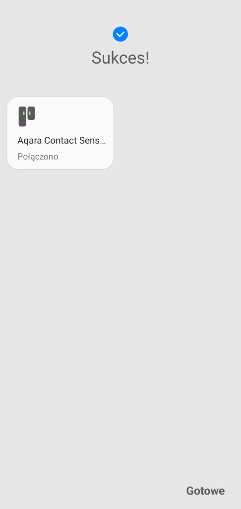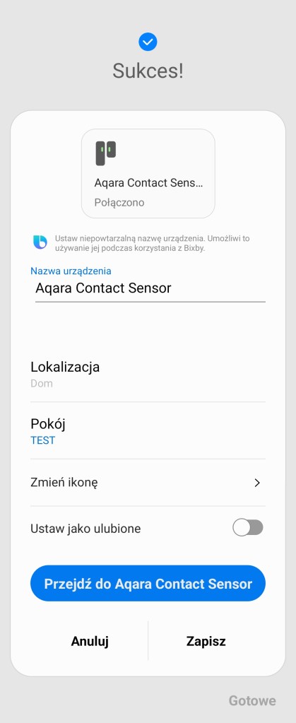 Aby dodać czujnik kontaktowy Aqara do aplikacji SmartThings, musimy wykonać poniższą instrukcję. Usuń zaślepkę baterii z wnętrza sensora. Na ekranie głównym aplikacji klikamy przycisk Dodaj ( + ), w prawym górnym rogu ekranu. Następnie Dodaj urządzenie, przesuwamy w dół do sekcji marek Wybór z listy urządzeń, wybieramy markę Aqara, a później Czujnik otwarcia/zamknięcia. Kontynuujemy pierwsze kroki instalacji, klikając Rozpocznij. Wybieramy centralę do połączenia z nowym urządzeniem. Pomijamy procedurę skanowania kodu QR (my nie otrzymaliśmy go z sensorem). Następnie na obudowie czujnika, używając spinacza, przytrzymaj przez 5 sekund przycisk resetu. Po chwili czujnik zostanie wykryty i dodany do platformy SmartThings. Może pojawić się komunikat o braku wsparcia pewnych funkcji bezpieczeństwa, pomijamy powiadomienie, wybierając OK. Po pomyślnym znalezieniu urządzenia możemy zmienić jego nazwę np. na Aqara Contact Sensor. Wybrać pokój dla nowego urządzenia, zmienić ikonę oraz dodać do panelu ulubionych. Kończymy proces instalacji, klikając Gotowe. Czujnik pojawi się w wybranym pomieszczeniu.