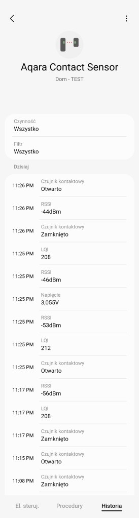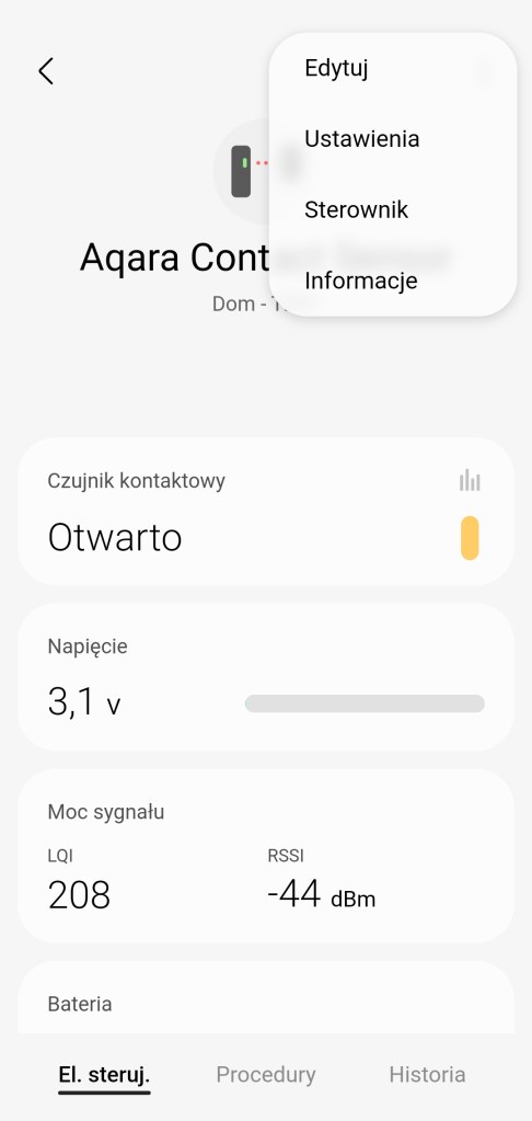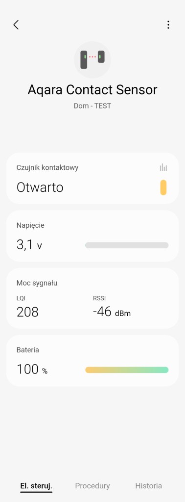W głównym panelu sterowania urządzeniem mamy informację o stanie czujnika „Otwarto” bądź „Zamknięto”. Poniżej znajdziemy informację o napięciu. Następnie pokazano moc sygnału. Będą to wartości RSSI (ang. Received Signal Strength Indicator) i LQI (ang. Link Quality Indicator), pomocne w budowaniu silnej sieci Zigbee. Ostatnią informacją jest poziom baterii, na jego odczyt zaraz po dodaniu, należy chwilę zaczekać. Na dole znajdziemy sekcję panel „Procedury” (dawniej „Automatyzacje”) znajdziemy tutaj listę procedur, gdzie używany jest czujnik otwarcia. Panel „Historii” nie różni się znacznie od innych urządzeń, mamy dostęp do sortowania i przestudiowania historii działań sensora. W ustawieniach „Edytuj” mamy standardową możliwość zmiany nazwy, ikony, lokalizacji, pokoju oraz możliwość dodania do panelu „Ulubione”.