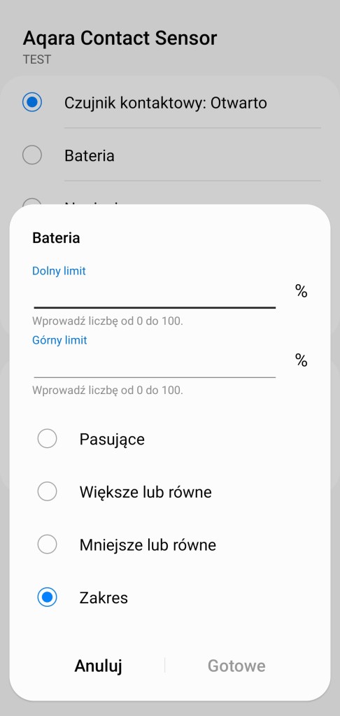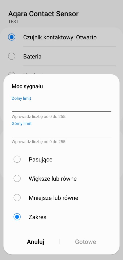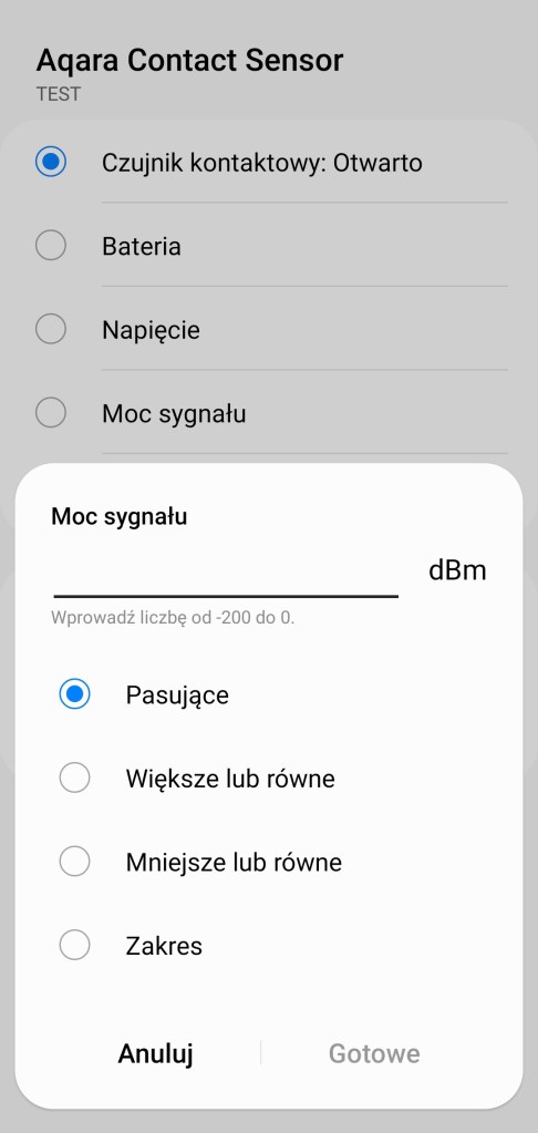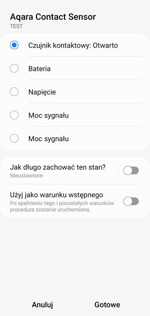 Przy tworzeniu procedur, dawniej automatyzacje „Jeśli … to Wtedy”, ze względu na specyfikę urządzenia, możliwe jest tylko wykorzystanie warunku „jeśli”. Mamy możliwość warunku, związanego ze stanem czujnika „Otwarto”, „Zamknięto” oraz „Otwarto lub Zamknięto”, czyli zmiana stanu. Następnie mamy opcję otrzymania powiadomienia o poziomie baterii z zakresu 0 – 100% w tym, czy jest pasująca, większa/mniejsza czy w określonym zakresie. Kolejno jest napięcie w zakresie 0 – 255 w tym, czy jest pasujące, większa/mniejsza od wartości, czy mieści się w zadanym zakresie. Podobnie moc sygnału w zakresie 0 – 100 oraz -200 – 0 dBm w tym, czy jest pasujące, większa/mniejsza od wartości, czy mieści się w zadanym zakresie. Każdą akcję możemy opóźnić o dowolny czas.