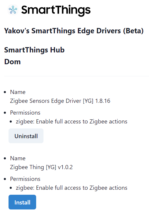 W tym celu instalacji sterownika SmartThings Edge należy wejść na stronę (https://account.smartthings.com/?redirect=https%3A%2F%2Fbestow-regional.api.smartthings.com%2Finvite%2F8b2Ay0rKX2ve%3F) oraz zalogować na konto Samsung, na którym został zbudowany Twój inteligentny dom. Zaakceptować warunki przystąpienia, wybierając ACCEPT. Klikając w Available Drivers (Dostępne sterowniki), wybieramy pożądane przez nas sterowniki urządzeń, w tym wypadku Zigbee Sensors Edge Driver [YG] 1.8.16, instalujemy je poprzez kliknięcie Install. W każdej chwili możemy odinstalować, klikając Uninstall. Pamiętajmy, że na chwilę obecną możemy zainstalować sterowników Edge maksymalnie 80. W przyszłości ta procedura nie będzie konieczna, do prawidłowego wykrycia czujnika Aqara.