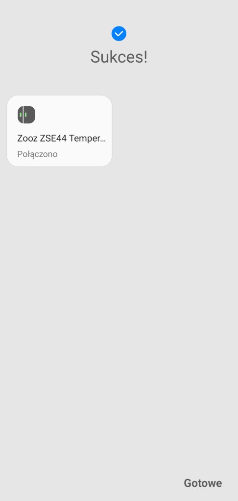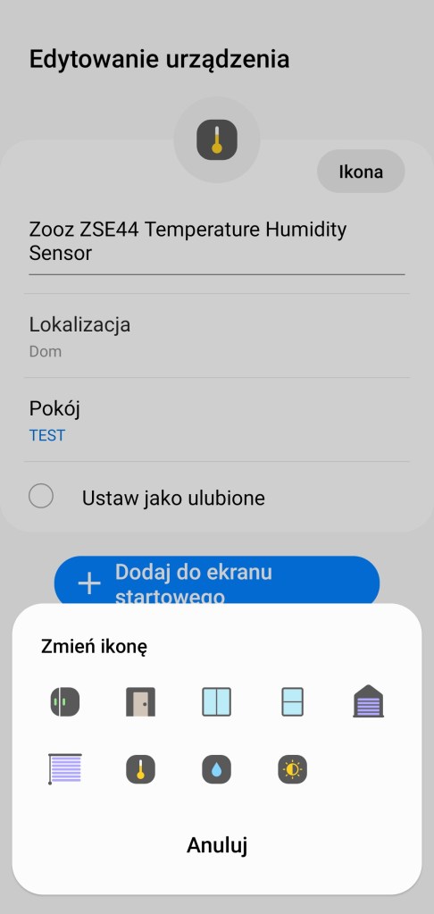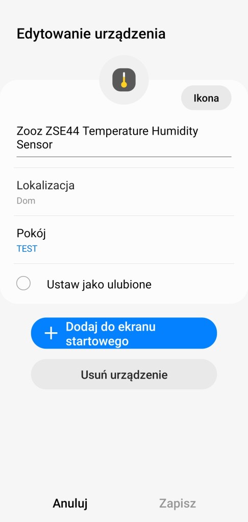 Aby dodać czujnik temperatury Zooz do aplikacji SmartThings, usuń zaślepkę baterii z wnętrza sensora. Na ekranie głównym aplikacji, klikamy Dodaj ( + ), znajdziesz go w prawym górnym rogu ekranu. Następnie Dodaj urządzenie, przesuwamy w dół do sekcji marek Wybór z listy urządzeń, wybieramy markę Zooz, a później Czujnik wielofunkcyjny, z dostępnych modeli zatwierdz Zooz ZSE44 Temperature Humidity XS Sensor. Kontynuujemy pierwsze kroki instalacji, klikając Rozpocznij. Wybieramy centralę do połączenia z nowym urządzeniem. Następnie wewnątrz obudowy czujnika, kliknij przycisk 3 razy. My wolimy pomijać procedurę skanowania kodu QR i wpisać go ręcznie. Kod QR znajdziesz wewnątrz urządzenia, przepisujemy go. Po chwili sensor zostanie wykryty i dodany do ekosystemu SmartThings. Po pomyślnym znalezieniu urządzenia możemy zmienić jego nazwę, wybrać pokój dla nowego urządzenia, zmienić ikonę oraz dodać do panelu ulubionych. Kończymy proces instalacji, klikając Gotowe. Czujnik temperatury i wilgotności pojawi się w wybranym pomieszczeniu.