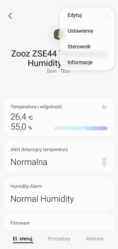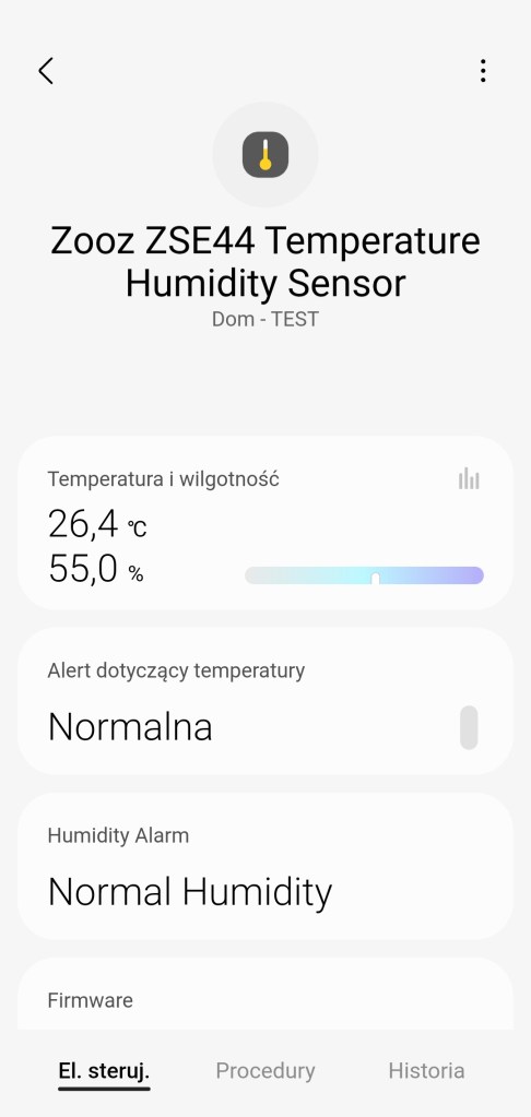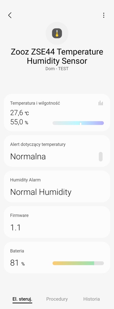 W głównym panelu sensora Zooz mamy możliwość odczytania zmierzonej temperatury i wilgotności, poniżej znajduje się alert dotyczący poziomu temperatury oraz wilgotności. Następnie posiadamy informację o wersji oprogramowania. Ostatnią informacją jest aktualny poziom baterii czujnika. Na dole znajdziemy sekcję panel „Procedury” (dawniej „Automatyzacje”) znajdziemy listę procedur, gdzie jest używany sensor. Panel „Historii” również nie różni się znacznie od innych urządzeń, mamy dostęp do sortowania i przestudiowania historii odczytów czujnika. W ustawieniach „Edytuj” mamy standardową możliwość zmiany nazwy, lokalizacji, pokoju, co jest rzadkością ikony czujnika temperatury oraz możliwość dodania do panelu „Ulubione”. Urządzenie posiada dodatkowe ustawienia, zostały one opisane w sekcji poniżej.