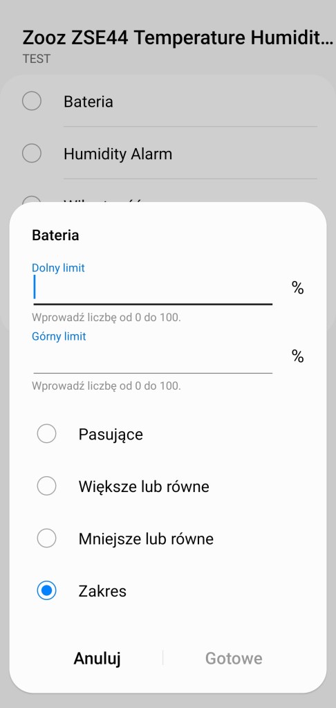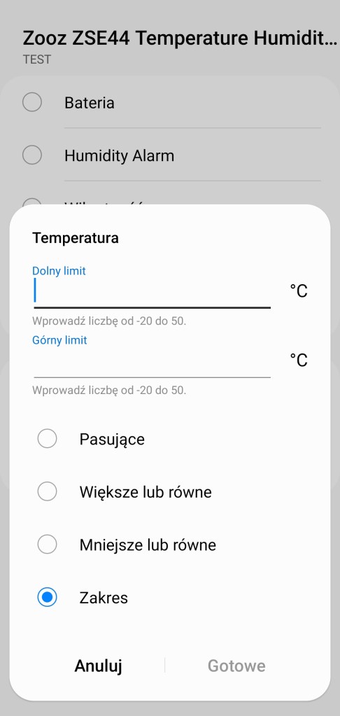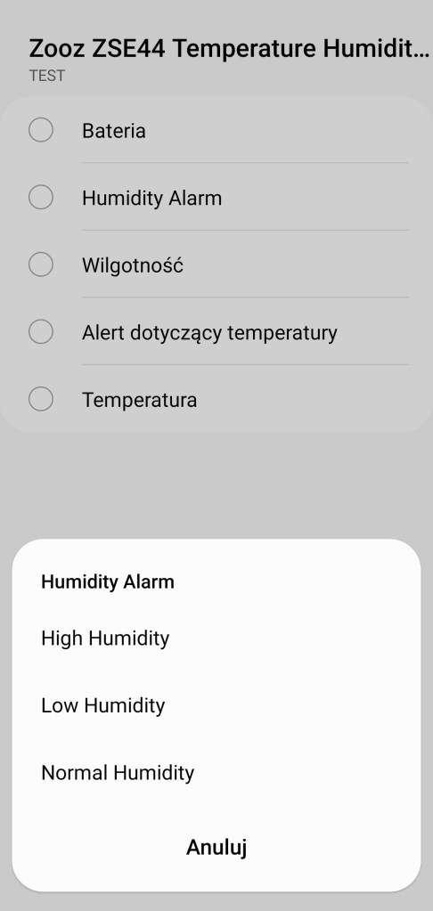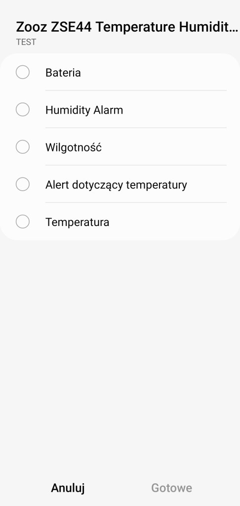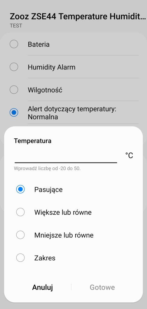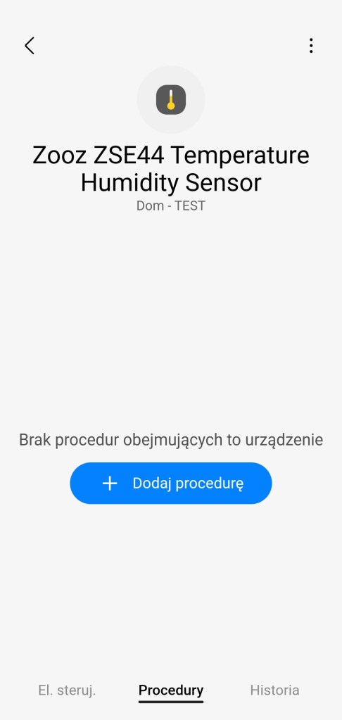 Tworzenie procedur (dawniej automatyzacje) „Jeśli … to Wtedy” ze względu na specyfikę urządzenia, możliwe jest tylko wykorzystanie warunku „jeśli”. Czujnik Zooz w pierwszej kolejności pozwala na wybranie opcji „Bateria”, czyli powiadomienie dotyczące poziomu baterii, rejestrowanej w zakresie 0 – 100% w tym, czy jest pasująca, większa/mniejsza czy w określonym zakresie. Poniżej znajdziemy „Humidity Alarm”, z trzema możliwościami: „High Humidity”, „Low Humidity” i „Normal Humidity”, jest to powiadomienie o zarejestrowaniu jednego z poziomów wilgotności (wysokim, niskim, normalnym). Następnie jest „Wilgotność” w odczytach 1 – 100%, czy większa/mniejsza niż wyznaczona oraz, czy znajduje się w podanym zakresie. Dalej „Aletr dotyczący temperatury” i ponownie z trzema możliwościami: „Normalna”, „Temperatura za wysoka” i „Temperatura za niska”. Poziomy rozpoczęcia kolejnych alertów można dostosować w ustawieniach. Ostatnią opcją jest „Temperatura”, czyli powiadomienie o temperaturze z zakresu -20 – +50°C, w tym czy są większa/mniejsza niż odczytana oraz wyznaczony zakres. Każdą z tych inicjacji procedury możemy opóźnić o dowolny czas i ustawić jako warunek wstępny.