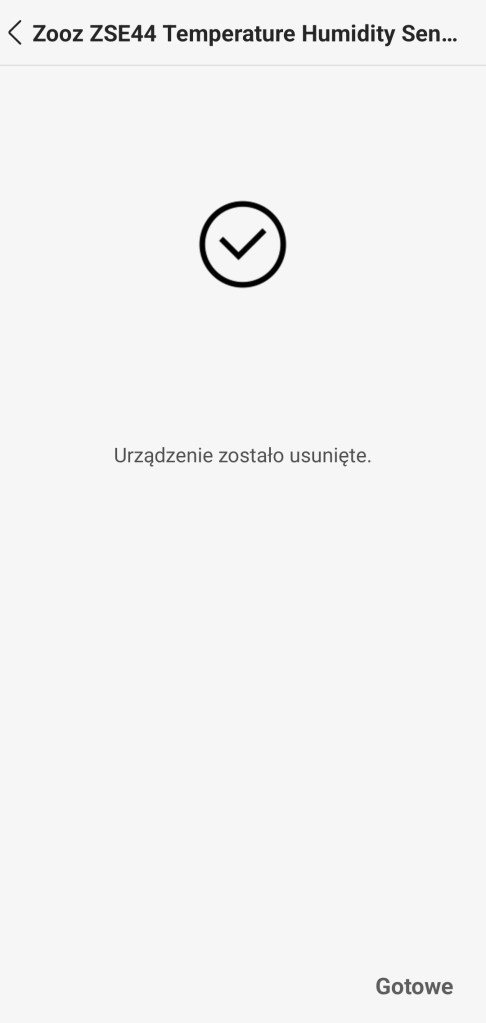 Aby usunąć sensor temperatury Zooz z ekosystemu SmartThings, należy wejść w główny ekran urządzenia. Kliknąć Więcej opcji ( ⋮ ) w prawym górnym rogu ekranu, a następnie Edytuj. W panelu edycji, wybieramy Usuń urządzenie. Następnie potwierdzamy operację, stukając Usuń. Następnie należy kliknąć 3 razy przycisk wewnątrz obudowy. Po chwili następuje komunikat o pozytywnym usunięciu.