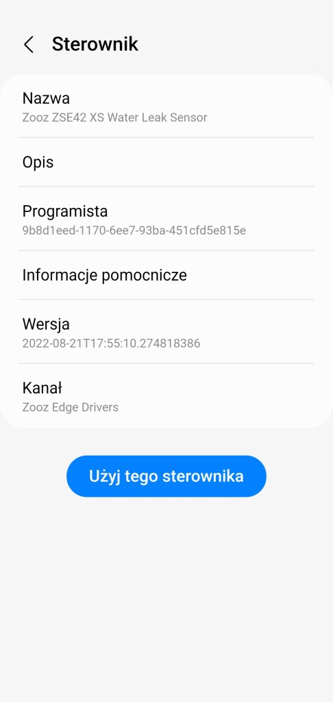 Jeśli Twoje urządzenie korzysta już ze sterownika brzegowego, możesz swobodnie zmieniać sterowniki Edge, z których korzysta. Społeczność SmartThings może stworzyć lepszy, albo z czasem sam producent stworzy oryginalny. Niekiedy wybrany automatycznie przez platformę SmartThings może nie spełniać Twoich wymagań i będziesz szukać lepszych zamienników. W takim przypadku możesz ręcznie zmienić używany sterownik Edge. Aby to zrobić, należy wejść w panel sterujący sensorem. W pierwszej kolejności klikamy Więcej opcji ( ⋮ ), a następnie Sterownik i Wybierz inny sterownik. Z listy dostępnych wybierz ten, który najlepiej działa oraz posiada rozbudowane funkcje, których potrzebujesz. Naszym zdaniem jest to sterownik z kanału dystrybucji Zooz Edge Drivers o nazwie Zooz ZSE42 XS Water Leak Sensor. Klikamy jego nazwę, dalej Użyj tego sterownika. Akceptujemy wybór, wybierając przy komunikacie OK. Następuje zmiana sterownika, może być potrzebna chwila na odświeżenie panelu sterowania. Możesz wyjść i wejść z panelu sensora. Na koniec ukaże się zaktualizowany panel sterowania z nowymi odczytami oraz opcjami. Czasem potrzeba jeszcze chwili cierpliwości aż pojawią się pierwsze odczyty wartości, u nas niestety trwało to kilka godzin.