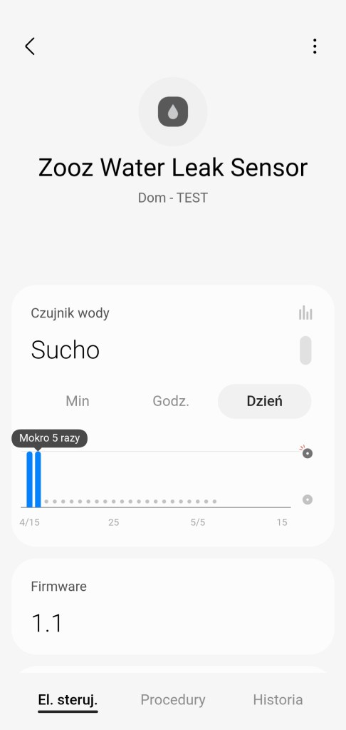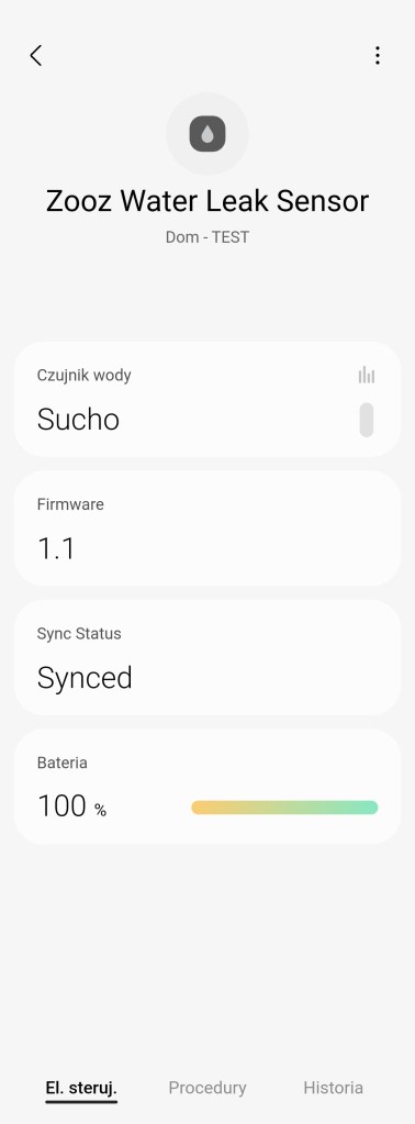 W głównym panelu sensora Zooz mamy informację o stanie czujnika, czy wykrył zalanie „Mokro”, czy też nie „Sucho”. Poniżej otrzymujemy informację o wersji oprogramowania oraz stan synchronizacji urządzenia. Ostatnią informacją jest aktualny poziom baterii czujnika. Na dole znajdziemy sekcję panel „Procedury„, znajdziemy tutaj listę procedur, gdzie jest używany sensor. Panel „Historii” również nie różni się znacznie od innych urządzeń, mamy dostęp do sortowania i przestudiowania historii odczytów czujnika. W ustawieniach „Edytuj” mamy standardową możliwość zmiany nazwy, lokalizacji, pokoju oraz możliwość dodania do panelu „Ulubione”. Urządzenie posiada dodatkowe ustawienia, zostały one opisane w sekcji poniżej.