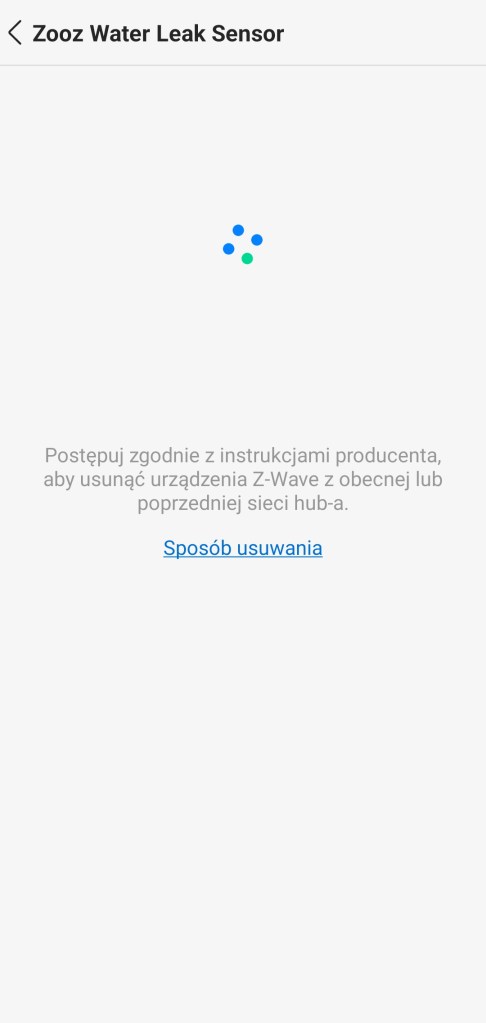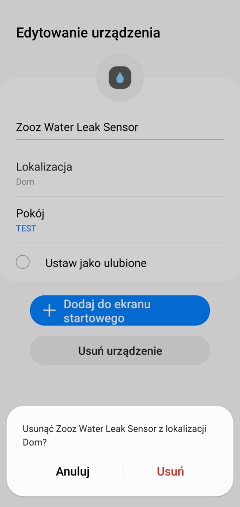 W celu usunięcia sensora zalania Zooz z ekosystemu SmartThings należy wejść w główny ekran urządzenia. Kliknąć Więcej opcji ( ⋮ ) w prawym górnym rogu ekranu, a następnie Edytuj. W panelu edycji, wybieramy Usuń urządzenie. Następnie potwierdzamy operację, stukając Usuń. Następnie należy kliknąć 3 razy przycisk wewnątrz obudowy. Po chwili następuje komunikat o pozytywnym usunięciu.