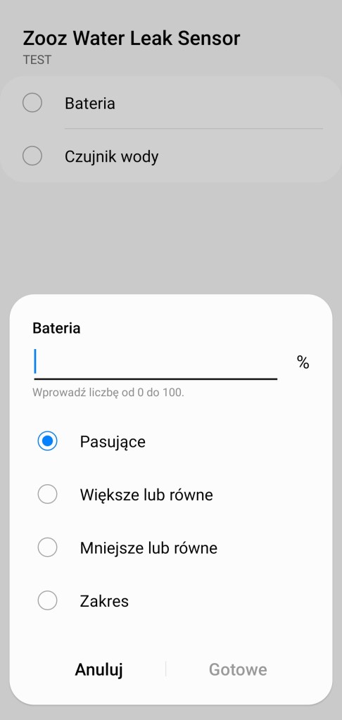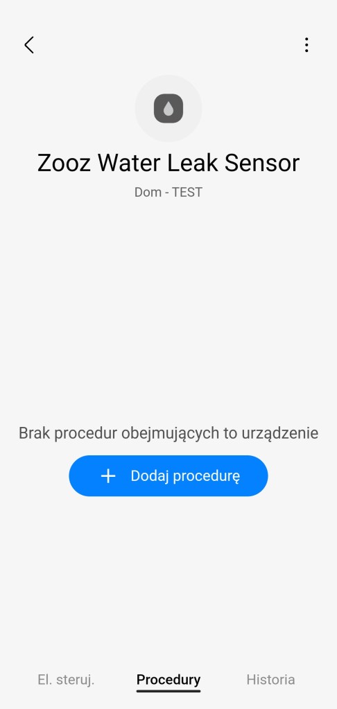 Tworzenie procedur (dawniej automatyzacje) „Jeśli … to Wtedy” ze względu na specyfikę urządzenia, możliwe jest tylko wykorzystanie warunku „jeśli”. Czujnik zalania Zooz w pierwszej kolejności pozwala na wybranie opcji „Bateria”, czyli powiadomienie dotyczące poziomu baterii, rejestrowanej w zakresie 0 – 100% w tym, czy jest pasująca, większa/mniejsza czy w określonym zakresie. Następną i ostatnią opcją jest „Czujnik zalania”, inicjacja alertu dotycząca wykrycia zalania, który posiada stan „Mokro” lub „Sucho”. Każdą z tych akcji procedury możemy opóźnić o dowolny czas i ustawić jako warunek wstępny.