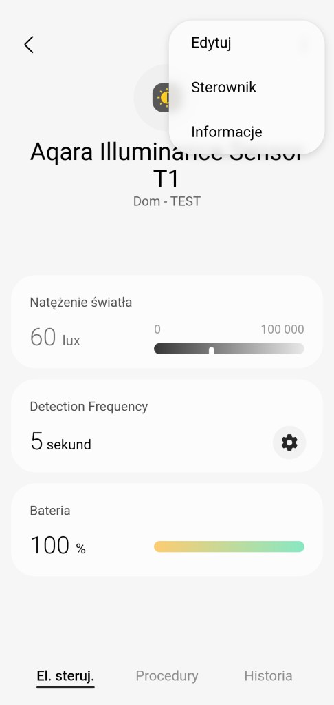 W głównym panelu sterowania sensorem mamy informację o zmierzonym natężeniu światła w zakresie od 0 do 100000 lux, choć pamiętajmy ze graniczną wartością czujnika jest 83 000 lux. Poniżej opcje „Detection Frequency”, czyli częstotliwość wykrywania. Możemy ustawić na 3 sek., 10 sek., 30 sek., jak i „Costomize”, czyli dostosuj i ustawić dowolny czas w sekundach w zakresie 2 – 59 sekund. Ostatnią informacją jest aktualny poziom baterii czujnika. Na dole znajdziemy sekcję panel „Procedury” (dawniej „Automatyzacje„) znajdziemy listę procedur, gdzie używany jest czujnik światła. Panel „Historii” również nie różni się znacznie od innych urządzeń, mamy dostęp do sortowania i przestudiowania historii działań urządzenia. W ustawieniach „Edytuj” mamy standardową możliwość zmiany nazwy, lokalizacji, pokoju oraz możliwość dodania do panelu „Ulubione”.