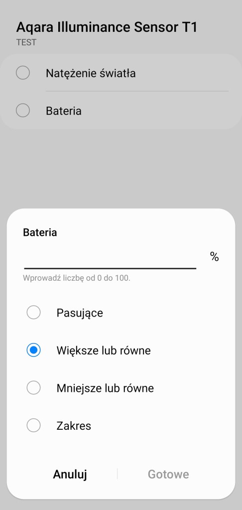 Przy tworzeniu procedur, dawniej automatyzacje „Jeśli … to Wtedy”, ze względu na specyfikę urządzenia mamy do wyboru tylko opcję „Jeśli”. Czujnik światła Aqara może inicjować procedurę kiedy natężenie światła osiągnie wartość z zakresu 0 – 100000 lux w tym, czy jest pasująca, większa/mniejsza czy w określonym zakresie. Choć pamiętajmy ze graniczną wartością czujnika jest 83 000 lux. Kolejno jest poziom baterii w zakresie 0 – 100% w tym, czy jest pasujące, większa/mniejsza od wartości, czy mieści się w zadanym zakresie. Każdą akcję możemy opóźnić o dowolny czas.