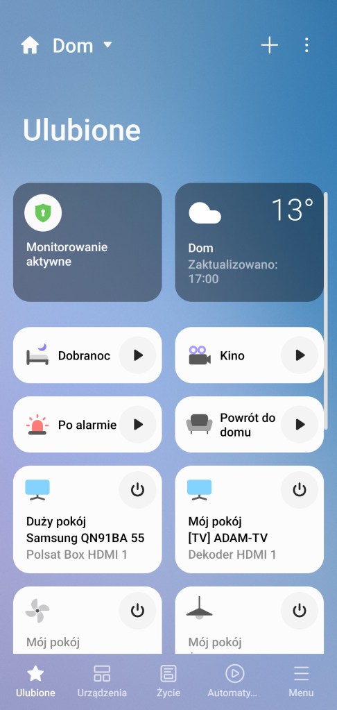 Aby zmienić sterownik, należy wejść panel sterowania urządzenia. Następnie klikamy Więcej opcji ( ⋮ ), z listy wybieramy Sterownik i Wybierz inny sterownik. Potwierdzamy wybór sterownika, klikając OK. Z przeprowadzonych testów, wynika, że najlepiej komunikuje się z urządzeniem sterownik autorstwa dewelopera Mariano o nazwie Zigbee Contact Mc. Wątek na forum SmartThings dotyczące ww. sterownika SmartThings Edge znajdziesz tutaj. W przyszłości, inne nowsze sterowniki mogą posiadać bardziej rozbudowane funkcje, zachęcamy do eksperymentów.