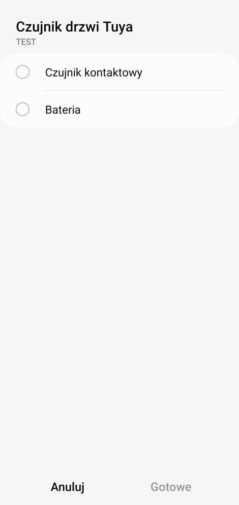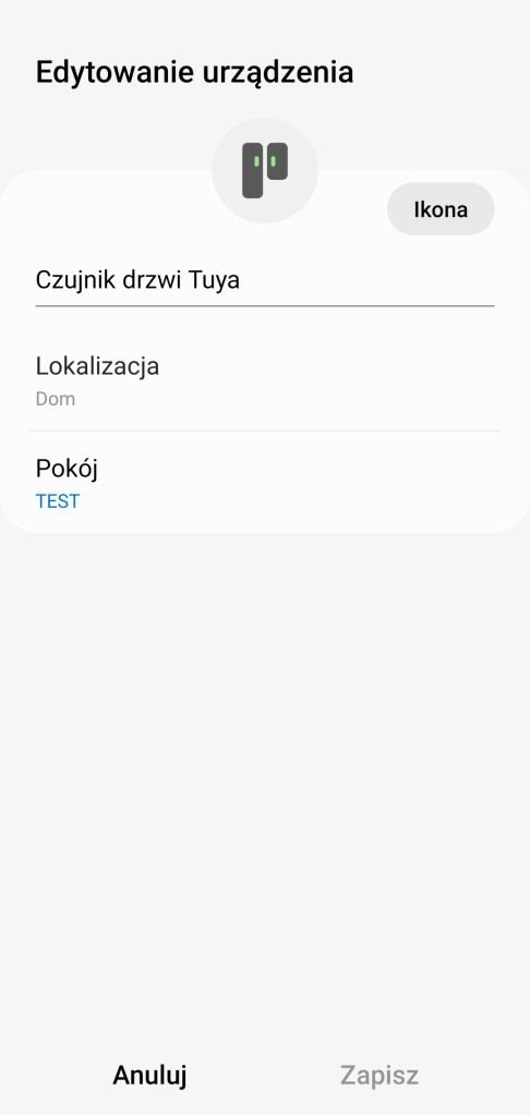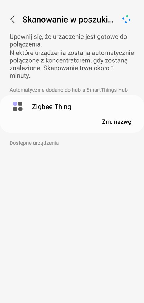 Aby dodać czujnik kontaktowy Tuya do aplikacji SmartThings, musimy wykonać poniższą instrukcję. Włóź baterie AAA do wnętrza sensora. Na ekranie głównym aplikacji, klikamy przycisk Dodaj ( + ), w prawym górnym rogu ekranu. Następnie Dodaj urządzenie, stuknij Skanuj znajdujący się w sekcji Skanowanie w poszukiwaniu urządzeń pobliżu. Teraz za pomocą spinacza, klikamy przycisk resetu. Znajdziemy go u dołu czujnika, będzie to mały otwór w sensorze. Wciskamy spinacz na około 5 sekund w otwór, aż dioda LED zacznie migać. Po chwili czujnik otwarcia/zamknięcia zostanie odlaleziony przez centralę platformy SmartThings. Możemy zmienić jego nazwę, czujnik Tuya znajdziesz w „nieprzypisanym” pokoju. Jak widzisz na poniższych screenach, czujnik nie został prawidłowo zidentyfikowany, jeśli będziesz mieć taką sytuację, przejdź do sekcji poniżej, gdzie opisuję jak zmienić sterownik Edge.