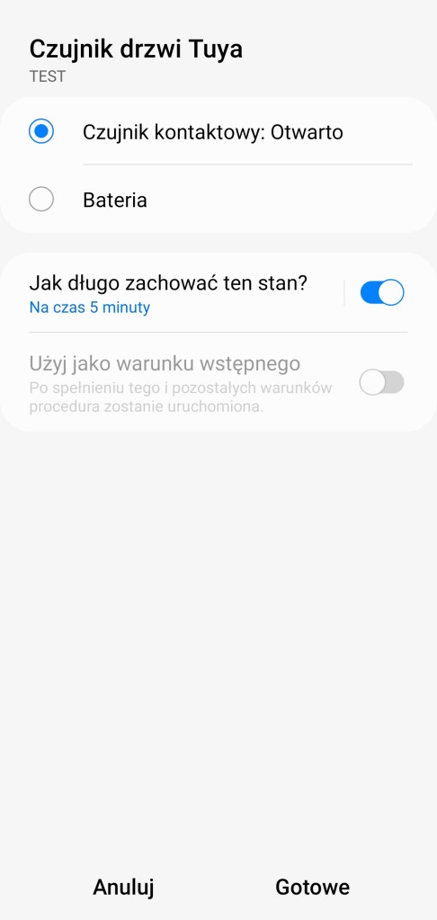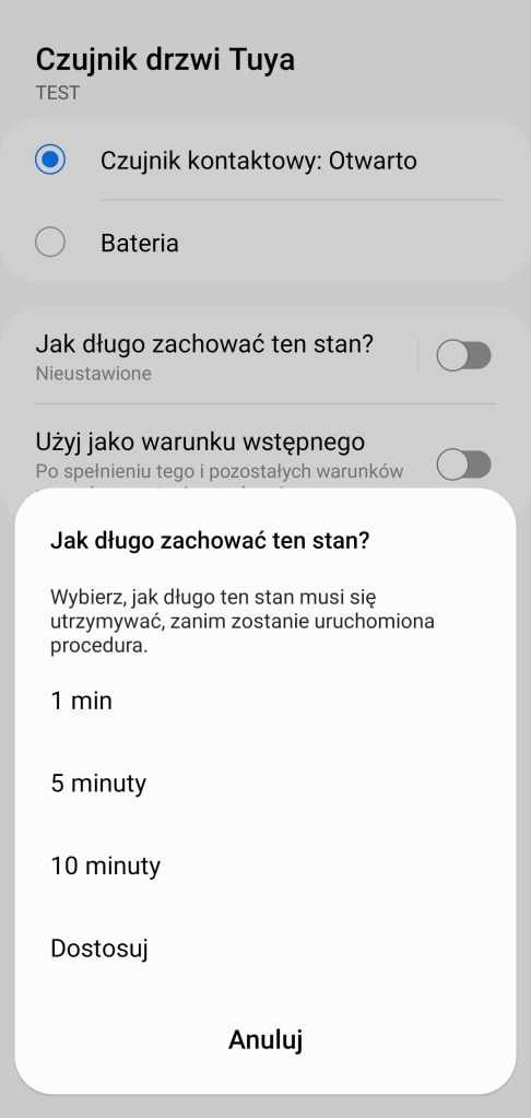 Przy tworzeniu procedur, dawniej automatyzacje „Jeśli … to Wtedy”, ze względu na specyfikę urządzenia, możliwe jest tylko wykorzystanie warunku „jeśli”. Mamy możliwość warunku, związanego ze stanem czujnika „Otwarto”, „Zamknięto” oraz „Otwarto lub Zamknięto”, czyli zmiana stanu. Następnie mamy opcję otrzymania powiadomienia o poziomie baterii z zakresu 0 – 100% w tym, czy jest pasująca, większa/mniejsza czy w określonym zakresie. Każdą akcję możemy opóźnić o dowolny czas oraz ustawić jako warunek wstępny.