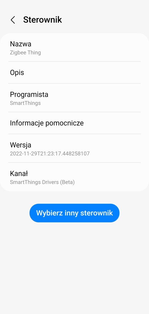 Jeśli korzystałeś z czujnika przed końcem 2022 roku, Twoje urządzenie może nie korzystać jeszcze ze sterownika SmartThings Edge. W przyszłości wszystkie urządzenia Zigbee i Z-wave przejdą na nowe sterowniki, nastąpi to po wygaśnięciu w ekosystemie, środowiska programistycznego Groovy. Ewentualnie możemy wymusić ręcznie zmianę na nowy sterownik. Niestety, aby zmienić sterownik, konieczne jest jego usunięcie i ponowne dodanie do platformy inteligentnego domu SmartThings.