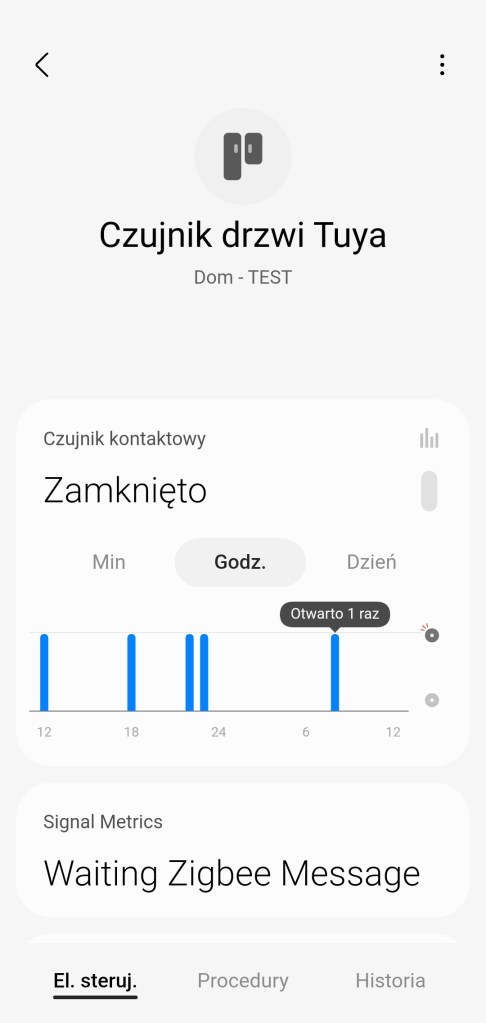 W głównym panelu sterowania urządzeniem mamy informację o stanie czujnika kontaktowego „Otwarto” bądź „Zamknięto”. Po naciśnięciu ikony wykresu, ukaże się oś czasu (do wybory: minuty, godziny i dni) z ukazanymi zmianami stanu i ich ilością w danym momencie. Następnie w sekcji „Signal Metrics” pokazano moc sygnału, wartość RSSI (ang. Received Signal Strength Indicator) i LQI (ang. Link Quality Indicator), pomocne w budowaniu silnej sieci Zigbee. Ostatnią informacją jest aktualny poziom baterii. Na dole znajdziemy sekcję panel „Procedury” (dawniej „Automatyzacje”) znajdziemy tutaj listę procedur, gdzie używany jest czujnik. Panel „Historii” nie różni się znacznie od innych urządzeń, mamy dostęp do sortowania i przestudiowania historii działań sensora. W ustawieniach „Edytuj” mamy standardową możliwość zmiany nazwy, ikony, lokalizacji oraz pokoju.