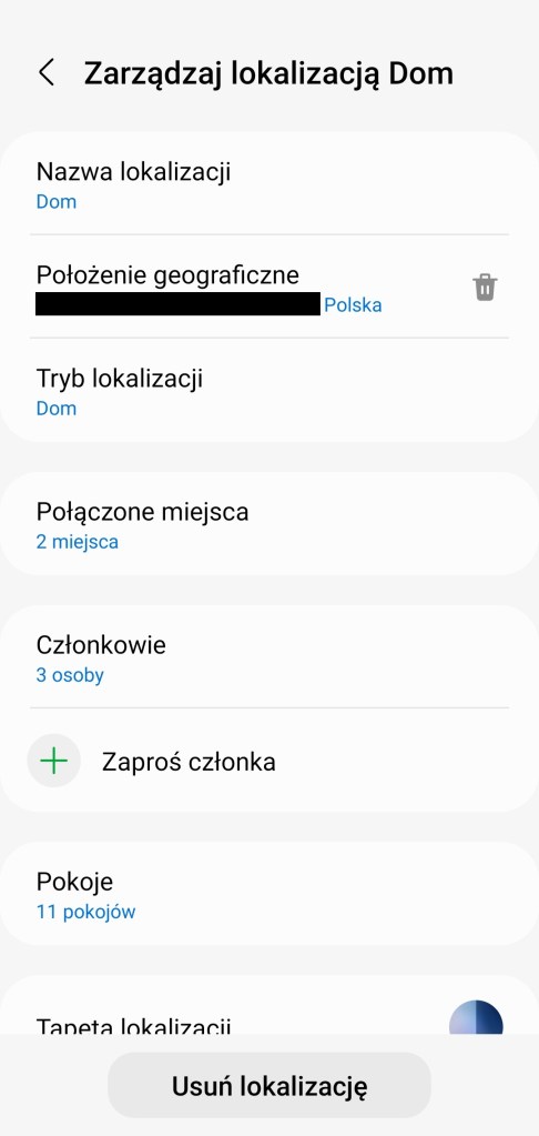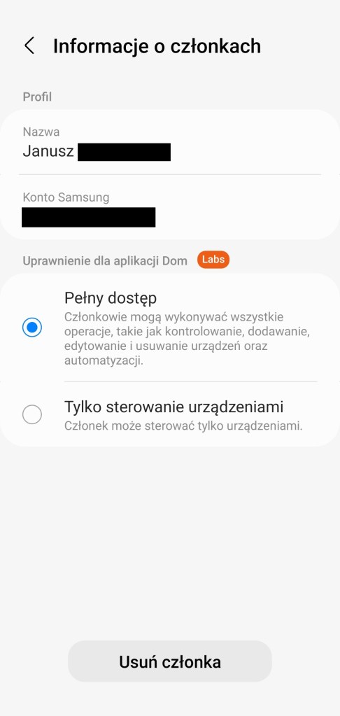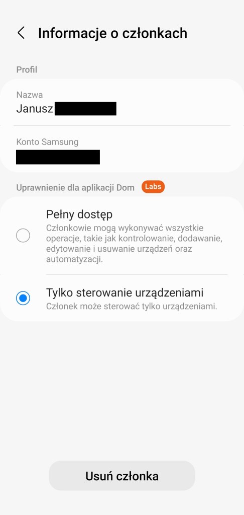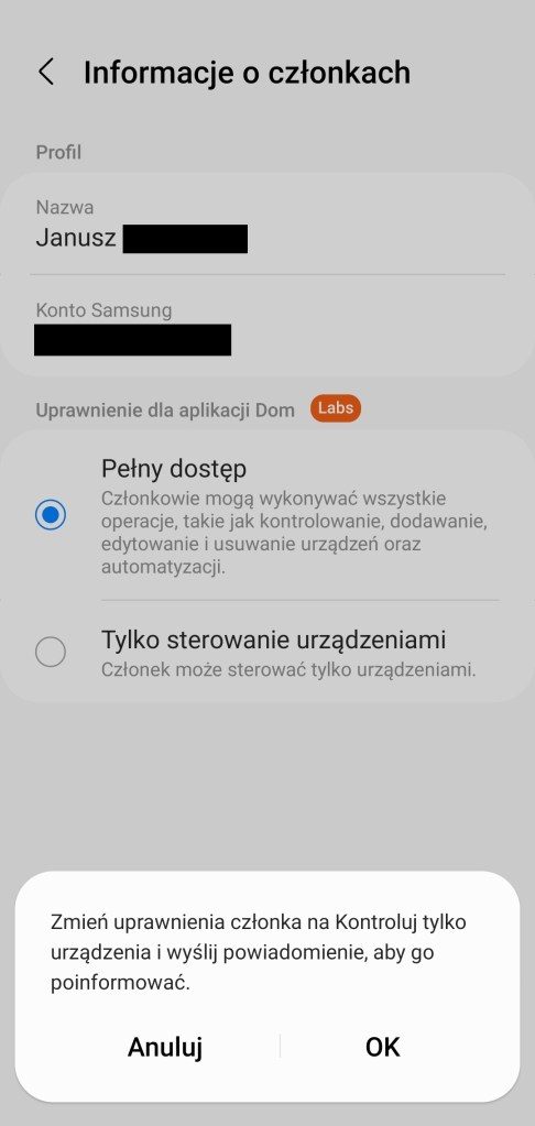 Aby zmienić uprawnienia, otwórz aplikację SmartThings, kliknij ikonę „domu” w lewym górnym rogu ekranu. Wybierz Zarządzanie lokalizacjami, następnie wybierz lokalizację, z listy kliknij opcje Członkowie. Pojawi się lista domowników w tej lokalizacji, wybierz właściwego. Pojawi się ustawienie Uprawnienia do aplikacji, tutaj masz do wyboru Pełny dostęp lub Tylko sterowanie urządzeniami. Wybierz ten drugi, pojawi się komunikat zatwierdzający, stuknij OK. W tym czasie na telefonie członka pojawi się powiadomienie. Uprawnienia zostały zmienione, domownik nie może już zmieniać skonfigurowanego SmartHome.