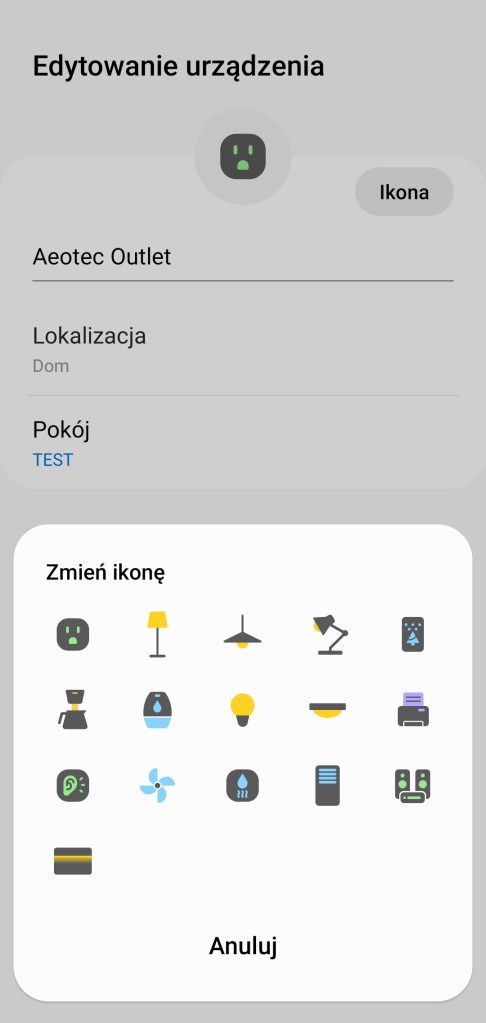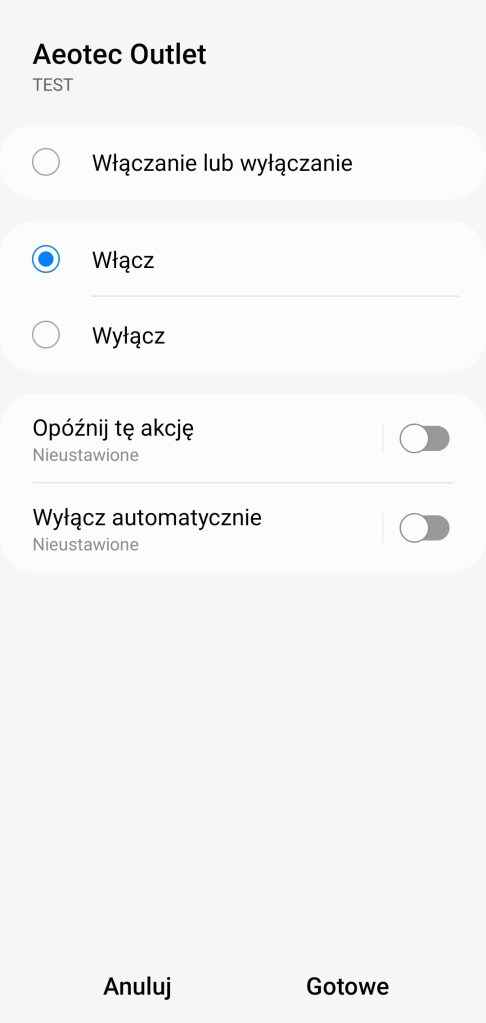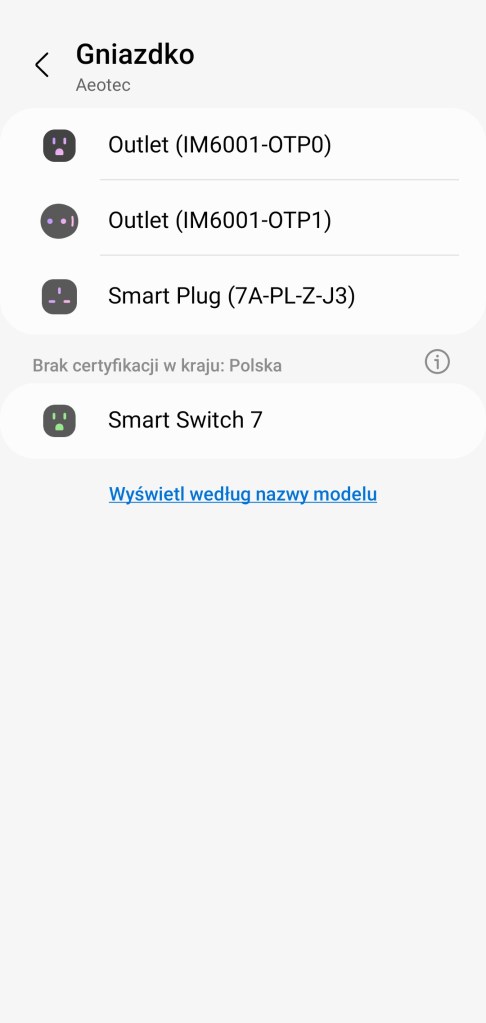 Dodanie do ekosystemu SmartThings jest niezwykle proste, wystarczy korzystać z polecań na ekranie. Przechodzimy do aplikacji SmartThings, na ekranie głównym aplikacji, klikamy Dodaj ( + ) znajdujący się w prawym górnym rogu ekranu, kolejno Urządzenie, przesuwamy w dół do sekcji marek Wybór z listy urządzeń, znajdujemy markę Aeotec, a później Gniazdko. Wybieramy model wtyczki w naszym wypadku to Outlet (IM6001-OTP1), klikamy Rozpoczęcie, uruchamiając tym samym proces konfiguracji. Kontynuujemy pierwsze kroki, wybierając centralę i pomieszczenie dla nowego urządzenia. Podłączamy inteligentne gniazdko do zasilania, dioda na urządzeniu zacznie migać. Po chwili zostanie znaleziona wtyczka i dodana do inteligentnego domu. Możemy zmienić nazwę gniazdka, jej ikonę lub dodać do panelu „Ulubione”. Zatwierdzamy zmiany wybierając Zapisz. Kończymy proces instalacji, klikając Gotowe.