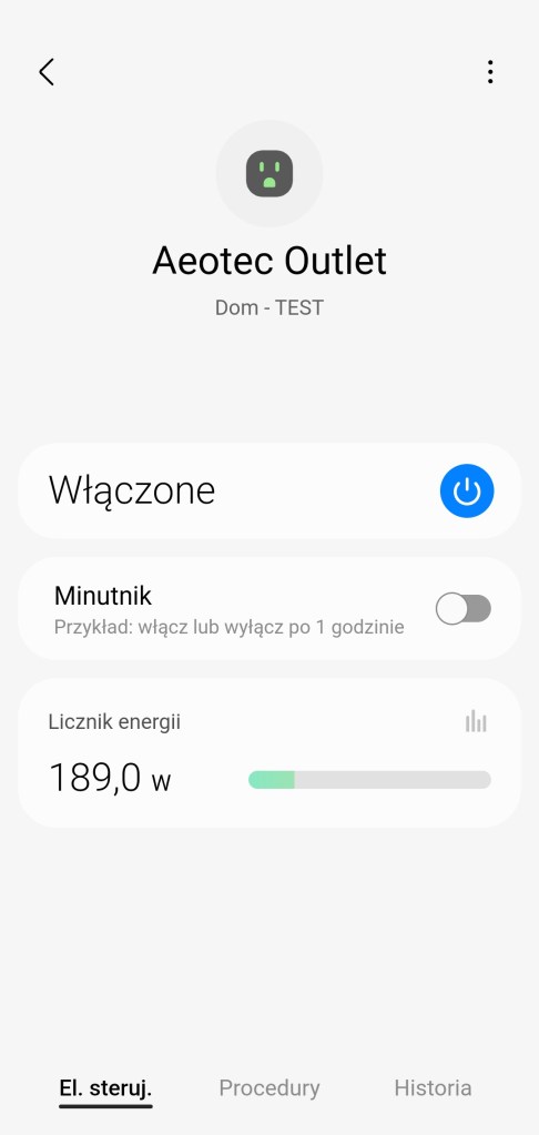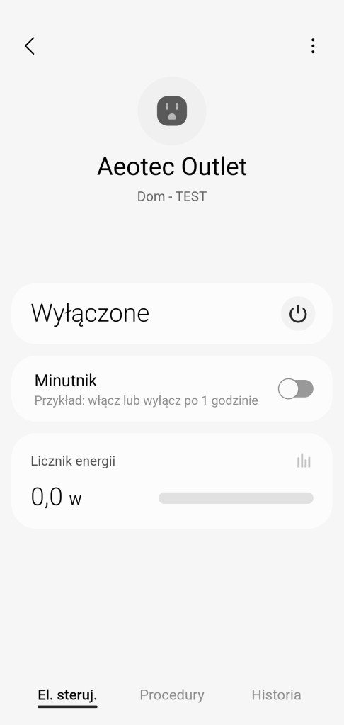 W głównym panelu sterowania urządzeniem mamy możliwość włączenia/wyłączenia gniazdka Aeotec oraz możliwość ustawienia minutnika. Na koniec mamy informację z licznika energii w watach. Na dole znajdziemy sekcję panel „Procedury” (dawniej „Automatyzacje„) znajdziemy tutaj szybkie procedury: włączenia i wyłączenia wtyczki o danej porze dnia oraz listę procedur, gdzie używane jest urządzenie. Panel „Historii” nie różni się znacznie od innych urządzeń, mamy dostęp do sortowania i przestudiowania historii działań gniazdka. W ustawieniach „Edytuj” mamy standardową możliwość zmiany nazwy, ikony, lokalizacji, pokoju oraz możliwość dodania do panelu „Ulubione”.