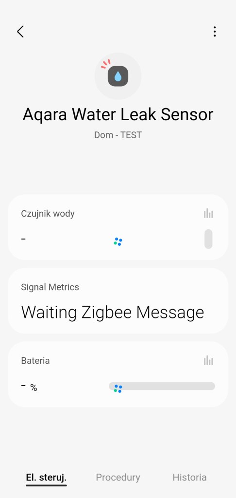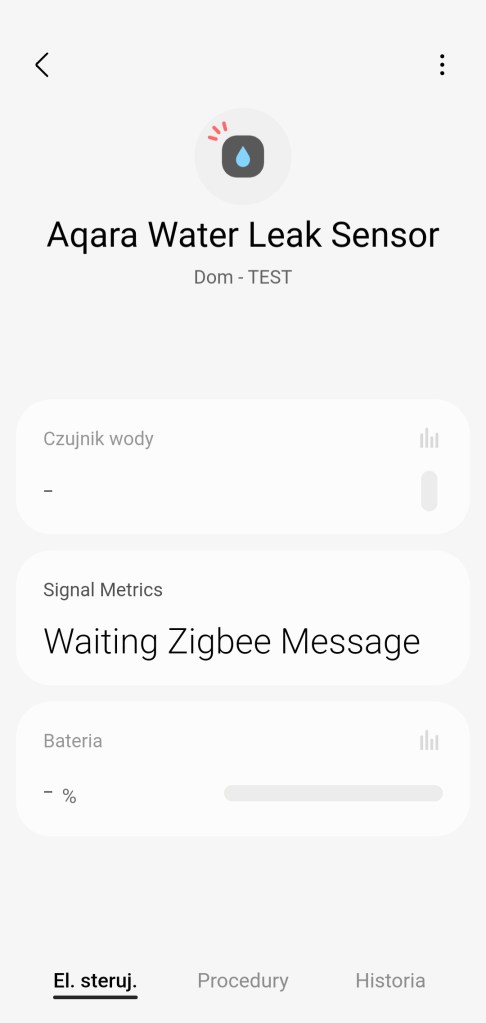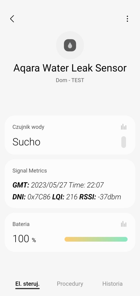 W głównym panelu sensora Aqara mamy informację o stanie czujnika, czy wykrył zalanie „Mokro”, czy też nie „Sucho”. Następnie w sekcji „Signal Metrics” pokazano moc sygnału, wartość RSSI (ang. Received Signal Strength Indicator) i LQI (ang. Link Quality Indicator), pomocne w budowaniu silnej sieci Zigbee. Ostatnią informacją jest aktualny poziom baterii. Na dole znajdziemy sekcję panel „Procedury„, znajdziemy tutaj listę procedur, gdzie jest używany sensor. Panel „Historii” również nie różni się znacznie od innych urządzeń, mamy dostęp do sortowania i przestudiowania historii odczytów czujnika. W ustawieniach „Edytuj” mamy standardową możliwość zmiany nazwy, lokalizacji oraz pokoju.
