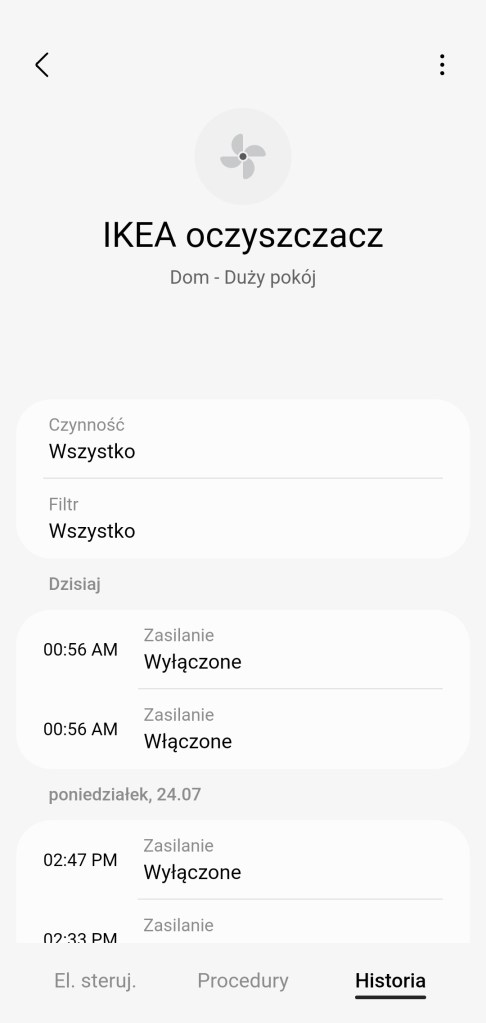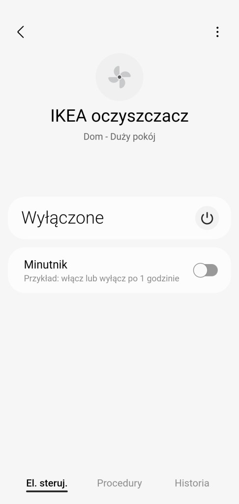W głównym panelu sterowania gniazdkiem mamy możliwość włączenia/wyłączenia oczyszczacza IKEA oraz możliwość ustawienia minutnika. Na dole znajdziemy sekcję panel „Procedury” (dawniej „Automatyzacje„) znajdziemy tutaj szybkie procedury: włączenia i wyłączenia wtyczki o danej porze dnia oraz listę procedur, gdzie używane jest urządzenie. Panel „Historii” nie różni się znacznie od innych urządzeń, mamy dostęp do sortowania i przestudiowania historii działań gniazdka. W ustawieniach „Edytuj” mamy standardową możliwość zmiany nazwy, ikony oraz pokoju.