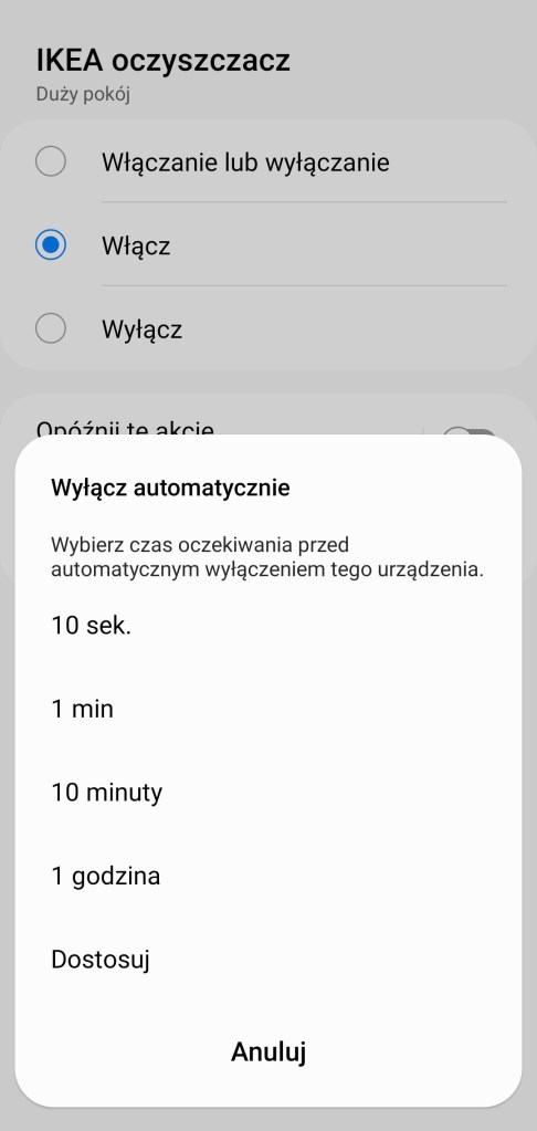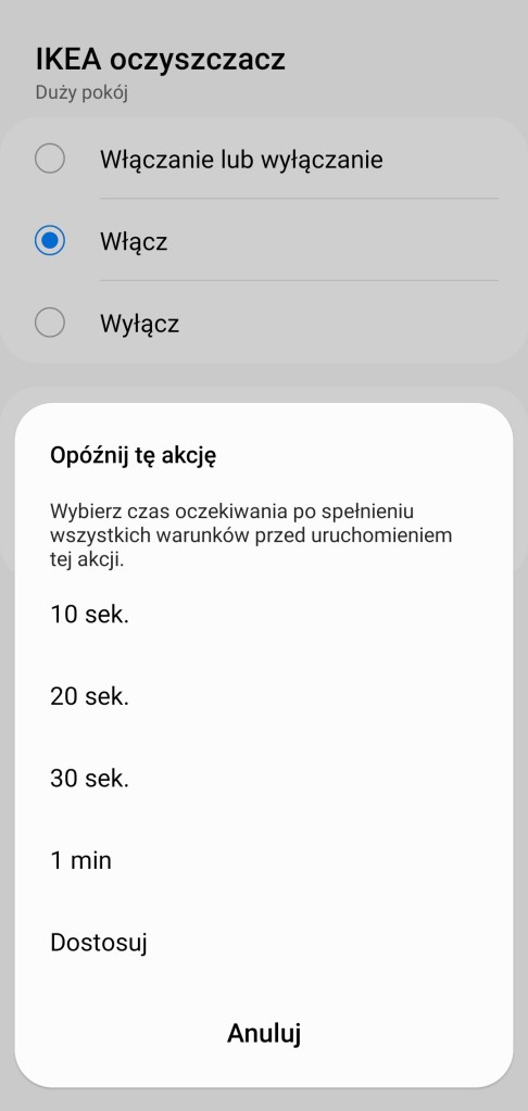 Tworzenie procedur (dawniej automatyzacje) „Jeśli … to Wtedy” musimy podzielić na dwa etapy, ponieważ znacznie różnią się dostępne opcje jeśli inicjujemy warunek „Jeśli” bądź „Wtedy”. W pierwszej możliwości „Jeśli” urządzenie pozwala na wybranie opcji „Włączono lub wyłączono”, czyli zmiana stanu, oraz „Włączone” i „Wyłączone”. Posiadamy możliwość ustawienia, jak długo dany stan ma trwać, zanim uruchomiona zostanie procedura. Możemy użyć go jako warunku wstępnego. W drugiej możliwości „Wtedy”, mamy ponownie opcje „Włączono lub wyłączono” – przypomnijmy zmiana stanu, „Włączone” i „Wyłączone”. Dodatkowo akcję uruchomienia możemy opóźnić o dowolny czas, jak i wyłączyć automatycznie po ustalonym czasie.